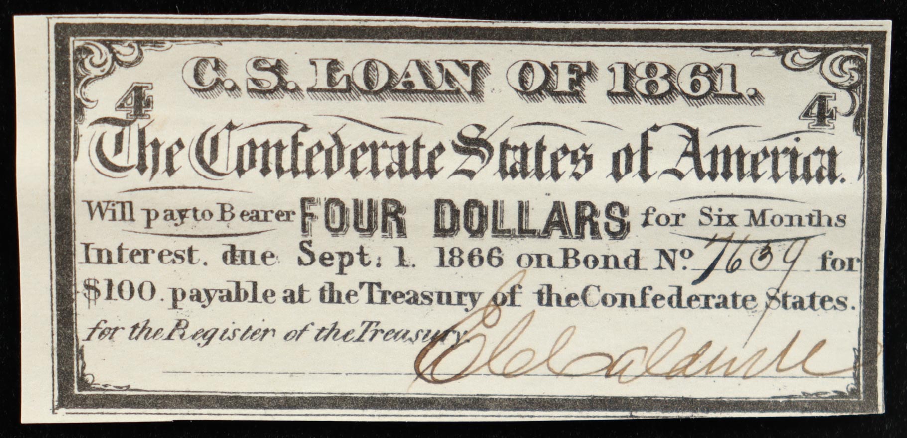 1861 $4 Confederate States of America CSA Bank Note Bond