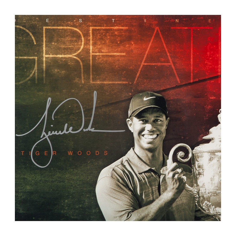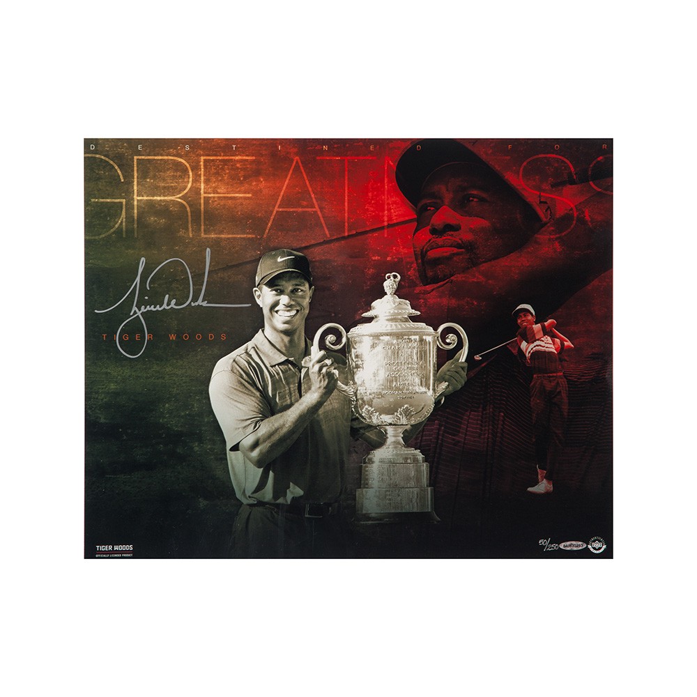 Ever since he putted at the age of 2 on The Mike Douglas Show, Tiger Woods has been destined for something special. It didn't come without hard work though. He practiced and studied the game to the point where he entered the PGA Tour as one of the most qualified and skilled golfers in history. Woods won the Junior World Championships six times and was the youngest U.S. Junior Amateur champion in history at the age of 15. He participated in his first PGA major at the age of 19 in the 1995 Masters. He turned pro the next year and has since captured 14 career major titles and 79 PGA Tour tournaments overall. This designed piece features three images of Woods at different stages of his career, from beginner to champion. Woods has autographed this limited edition (250) "Destined For Greatness" 20 x 16 designed image in silver paint pen. His signature is deemed authentic by virtue of Upper Deck Authenticated Five-Step Process.