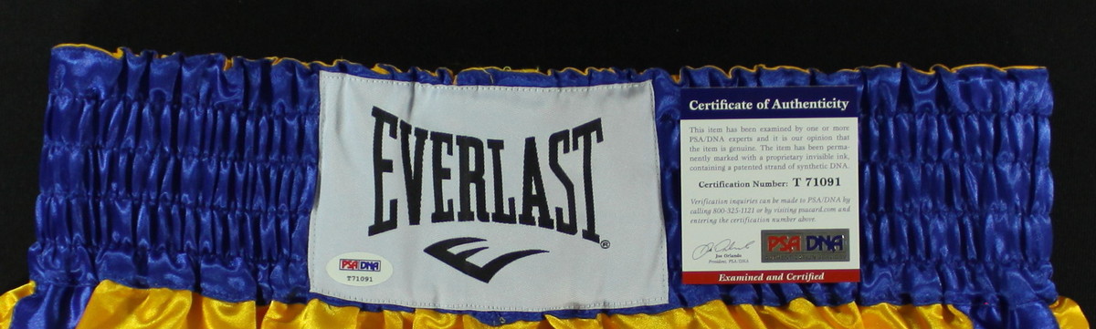 Everlast boxing trunks, size L. Hand-signed in black felt-tip pen by Sugar Shane Mosley. Autograph includes a PSA/DNA Hologram and COA for authenticity purposes.