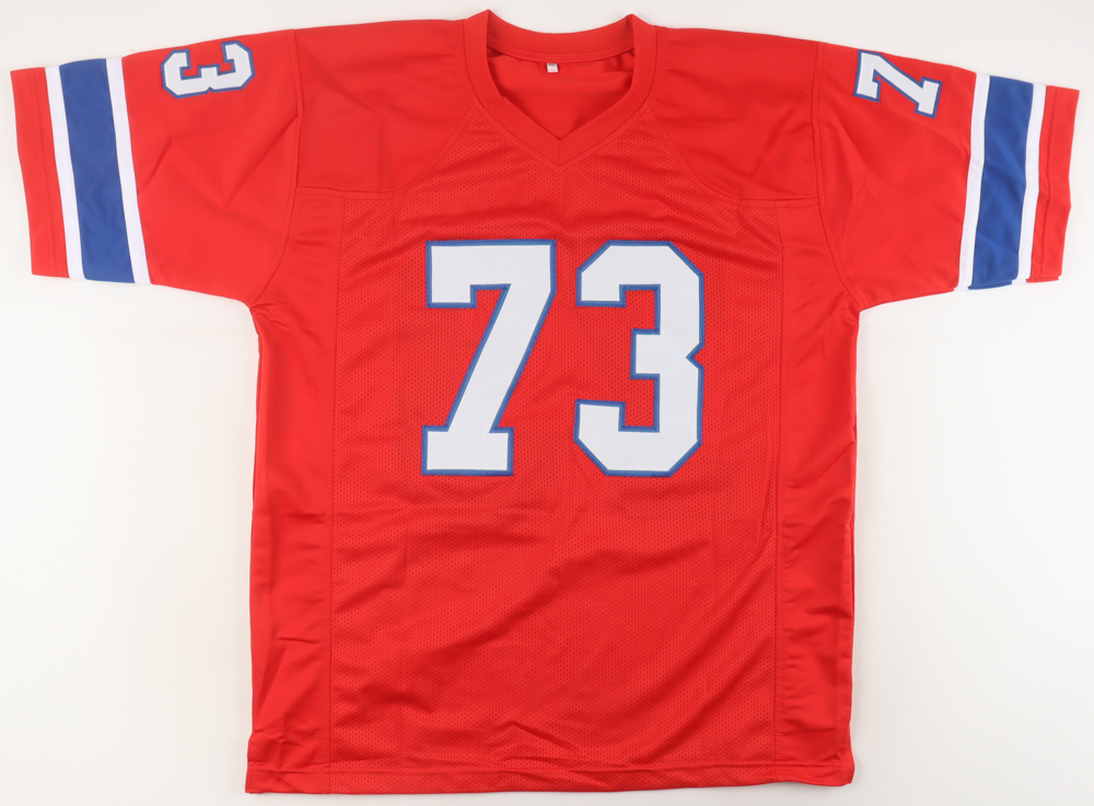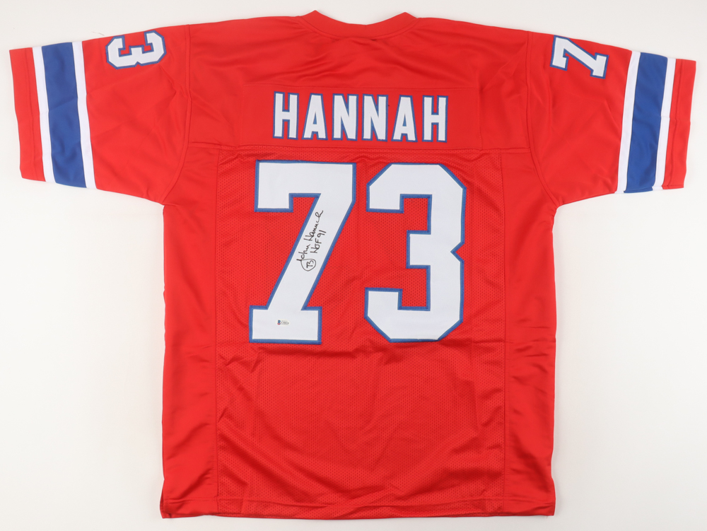 Custom jersey. Everything is sewn on, size XL. Hand-signed and inscribed by John Hannah (HOF). Please note, the signature has bled.