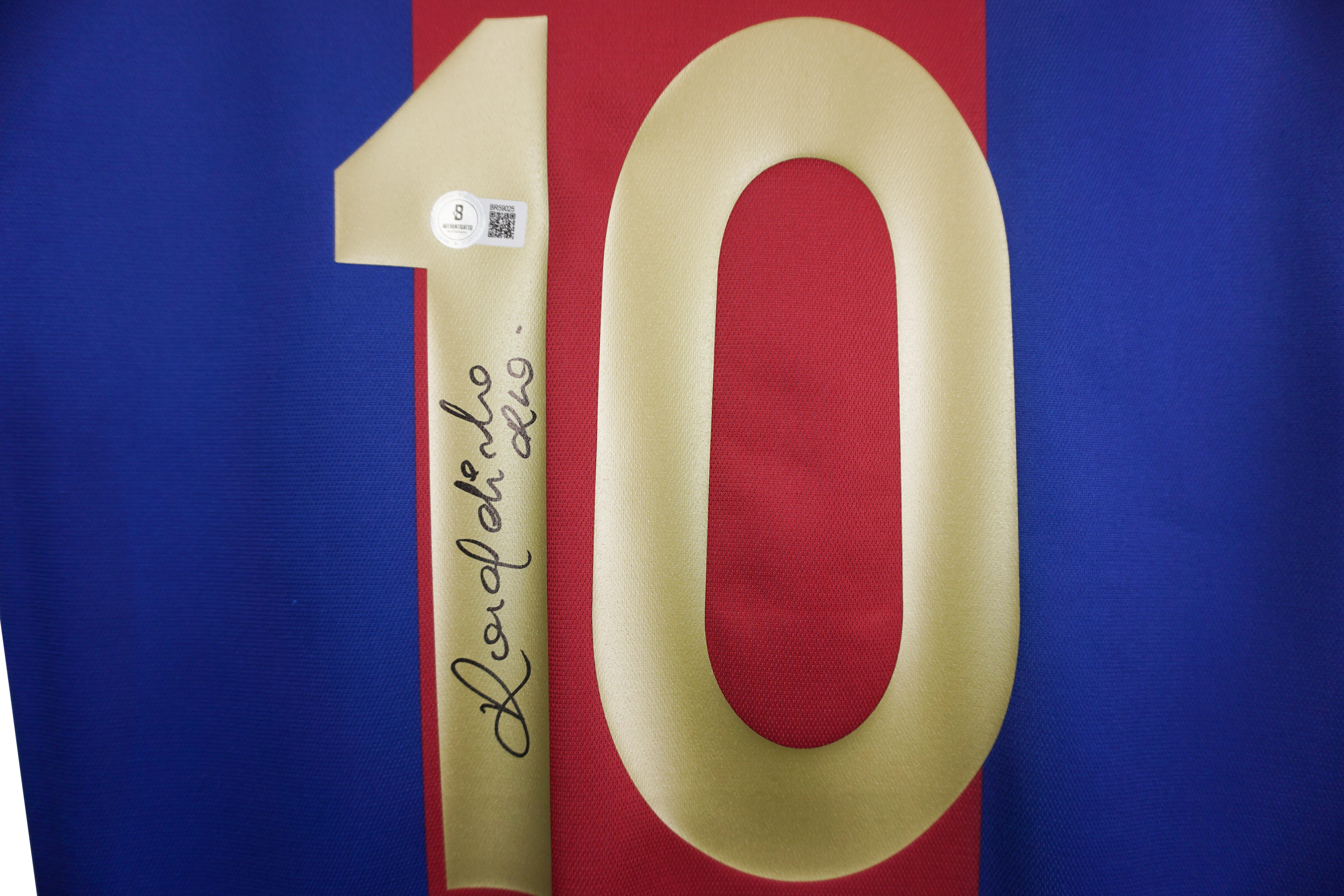 Nike style jersey with everything pressed on, size L. Hand-signed by Ronaldinho.