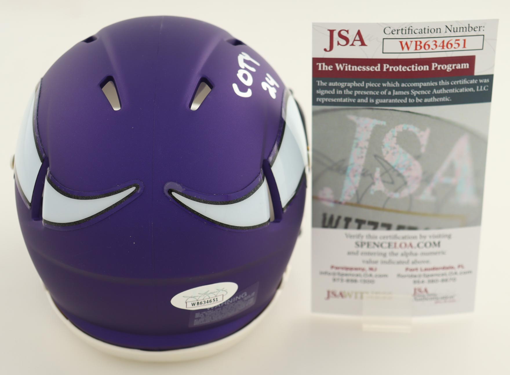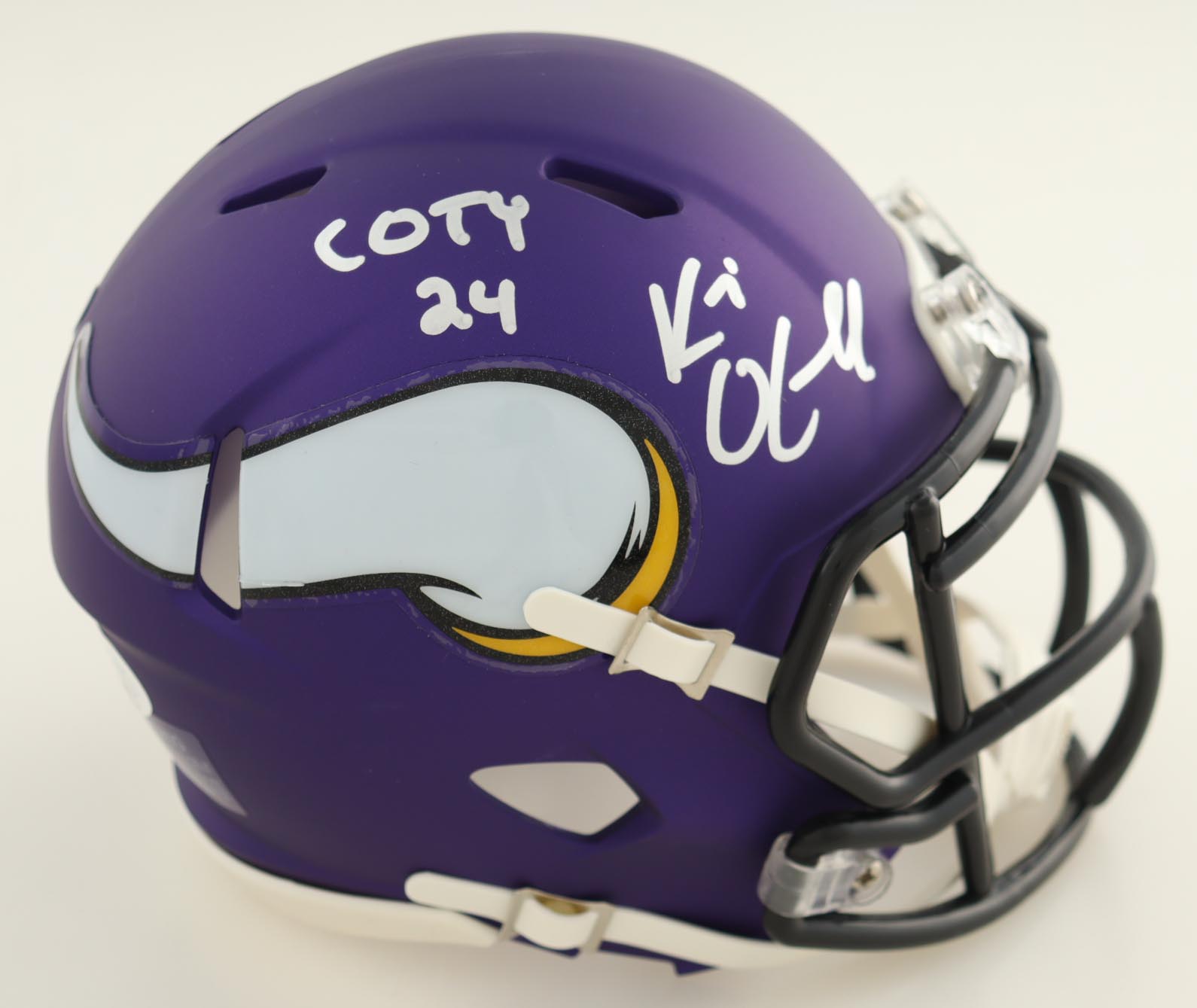 Riddell Minnesota Vikings Speed Mini Helmet. Hand-signed and inscribed by Kevin O'Connell.