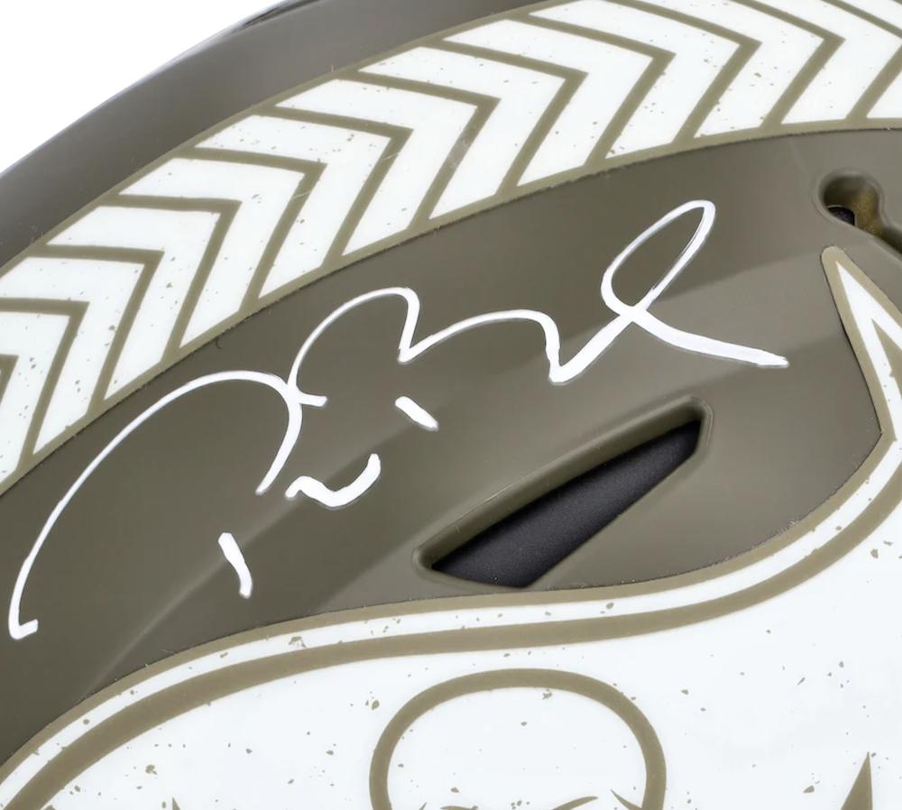 Riddell Tampa Bay Buccaneers full-size authentic on-field salute to service alternate speedflex helmet has been hand-signed by Tom Brady.