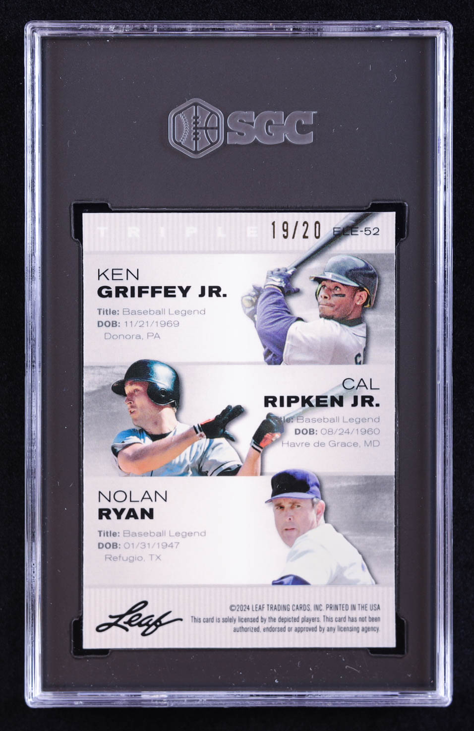 Ken Griffey Jr. / Cal Ripken Jr. / Nolan Ryan 2024 Leaf Special Release Metal Exclusive Legends Edition Crystal Blue #ELE52 #19/20 (SGC 10)
