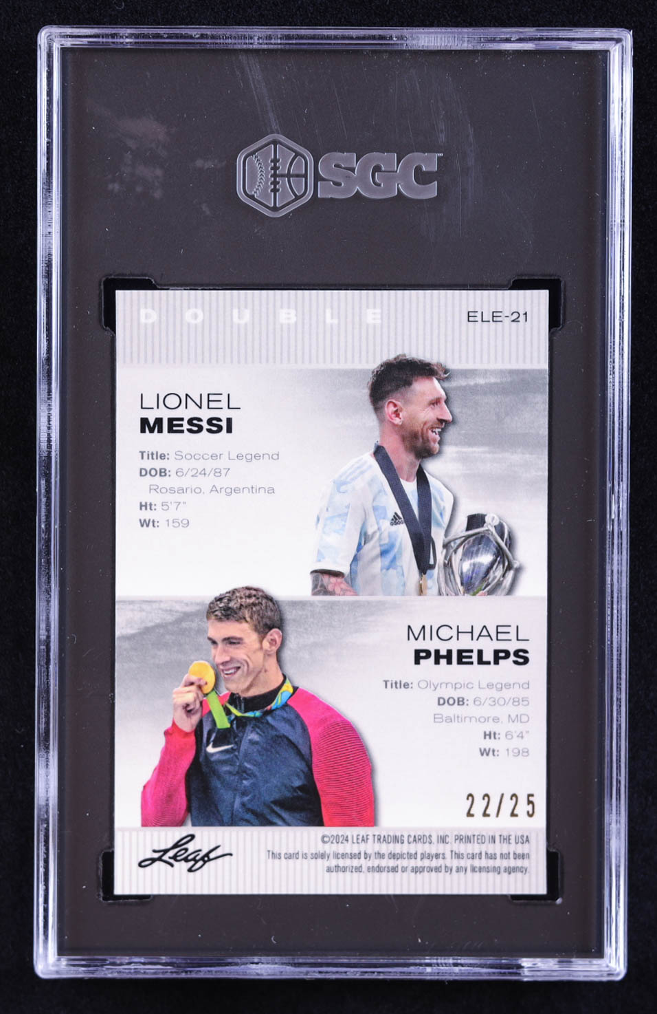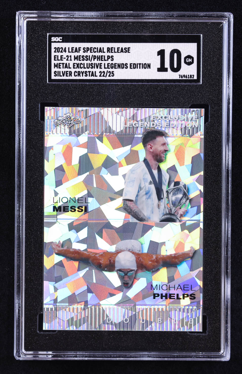 Lionel Messi / Michael Phelps 2024 Leaf Special Release Metal Exclusive Legends Edition Crystal Silver #ELE21 #22/25 (SGC 10)