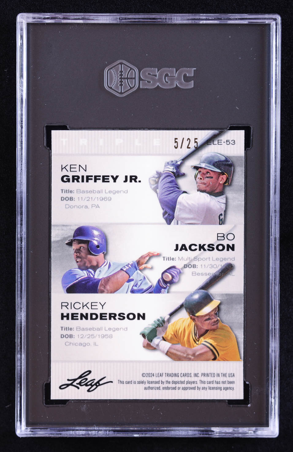 Ken Griffey Jr. / Bo Jackson / Rickey Henderson 2024 Leaf Special Release Metal Exclusive Legends Edition Crystal Silver #ELE53 #05/25 (SGC 9.5)