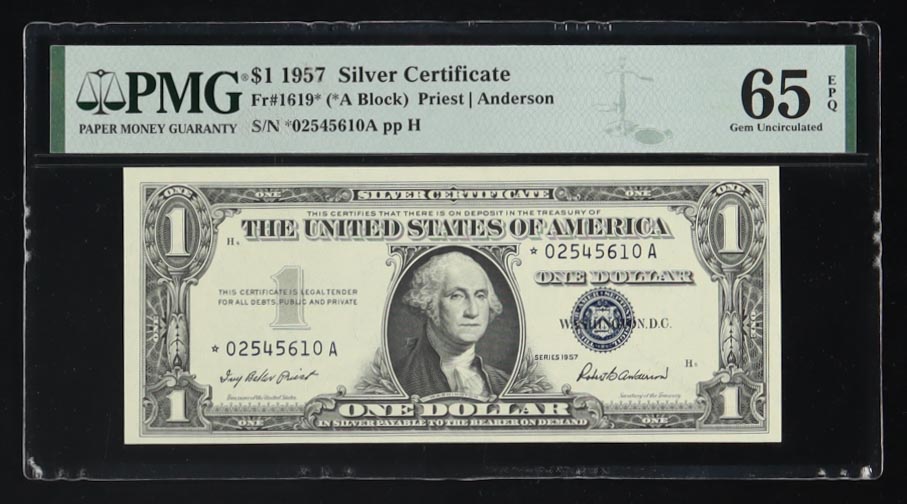 1957 U.S. $1 Silver Certificate "Star Note" - Fr. 1619* Signed: Priest / Anderson (PMG Gem Uncirculated 65 EPQ)