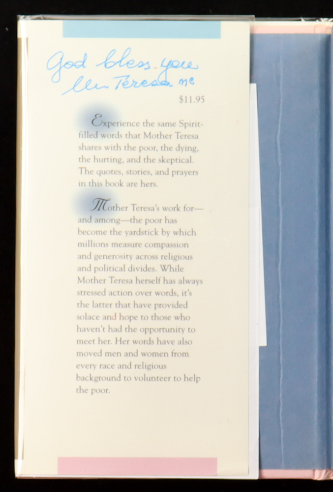 "In My Own Words" hardcover book has been hand-signed and inscribed on the inside cover dust jacket by Mother Mary Teresa Bojaxhiu. Please note there is damage to the book, and the book was inscribed on the inside title page as a gift for Mother's Day 1996 from "Betty Jo" & "Jerry".