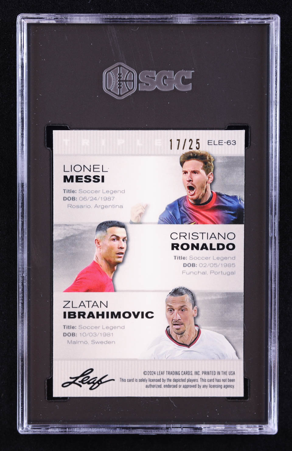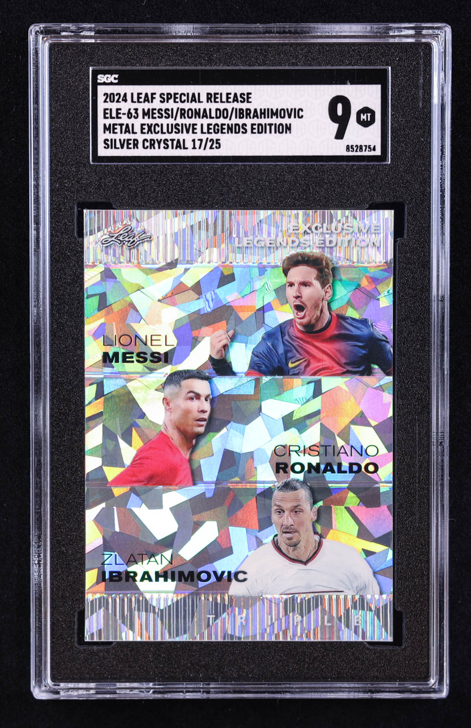 Lionel Messi / Cristiano Ronaldo / Zlatan Ibrahimovic 2024 Leaf Metal Special Release Exclusive Legends Edition Crystal Silver #ELE63 #17/25 (SGC 9)