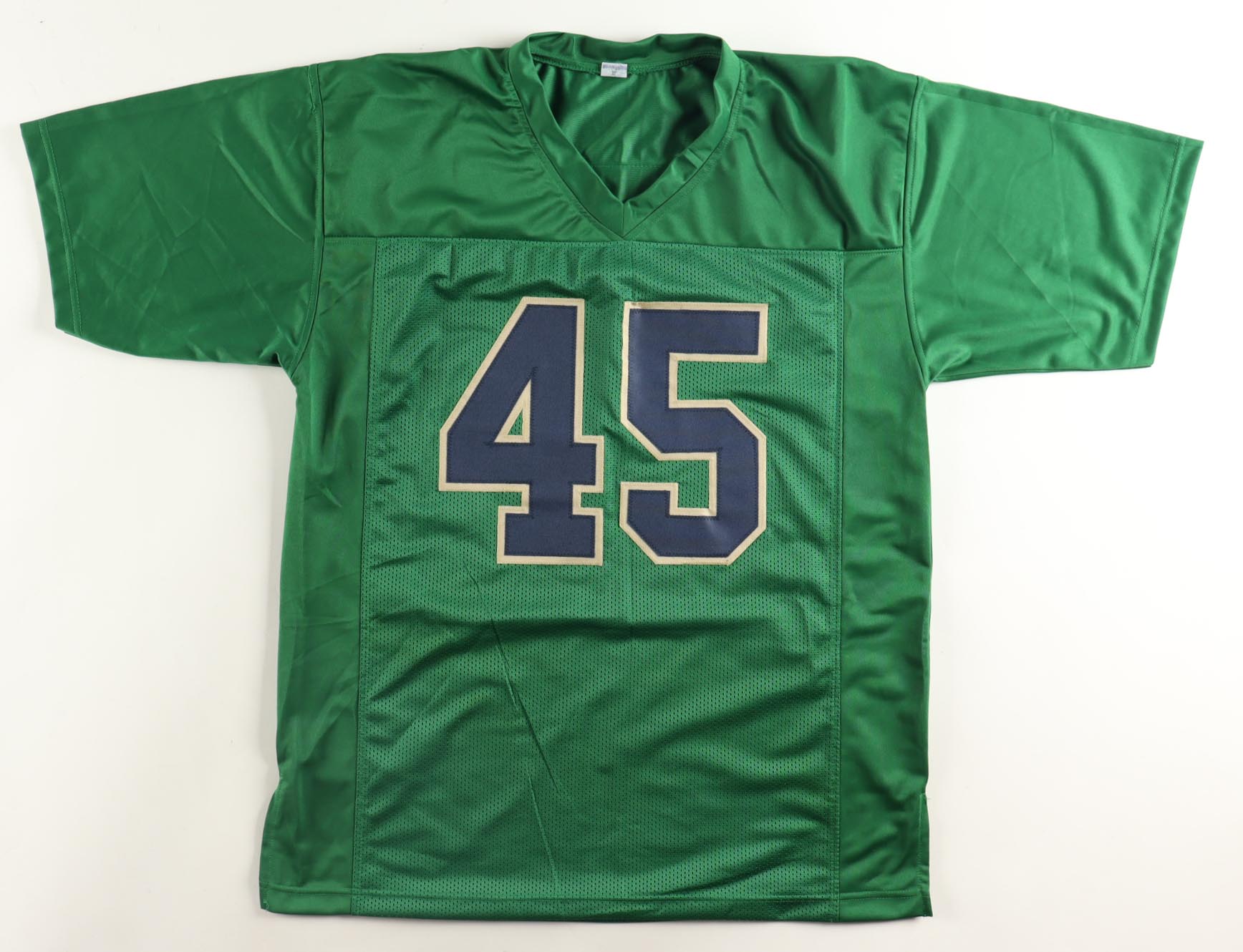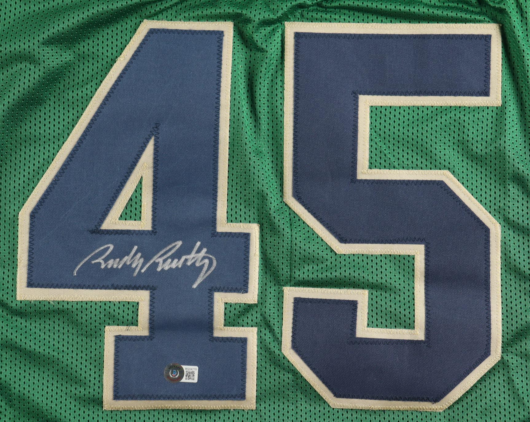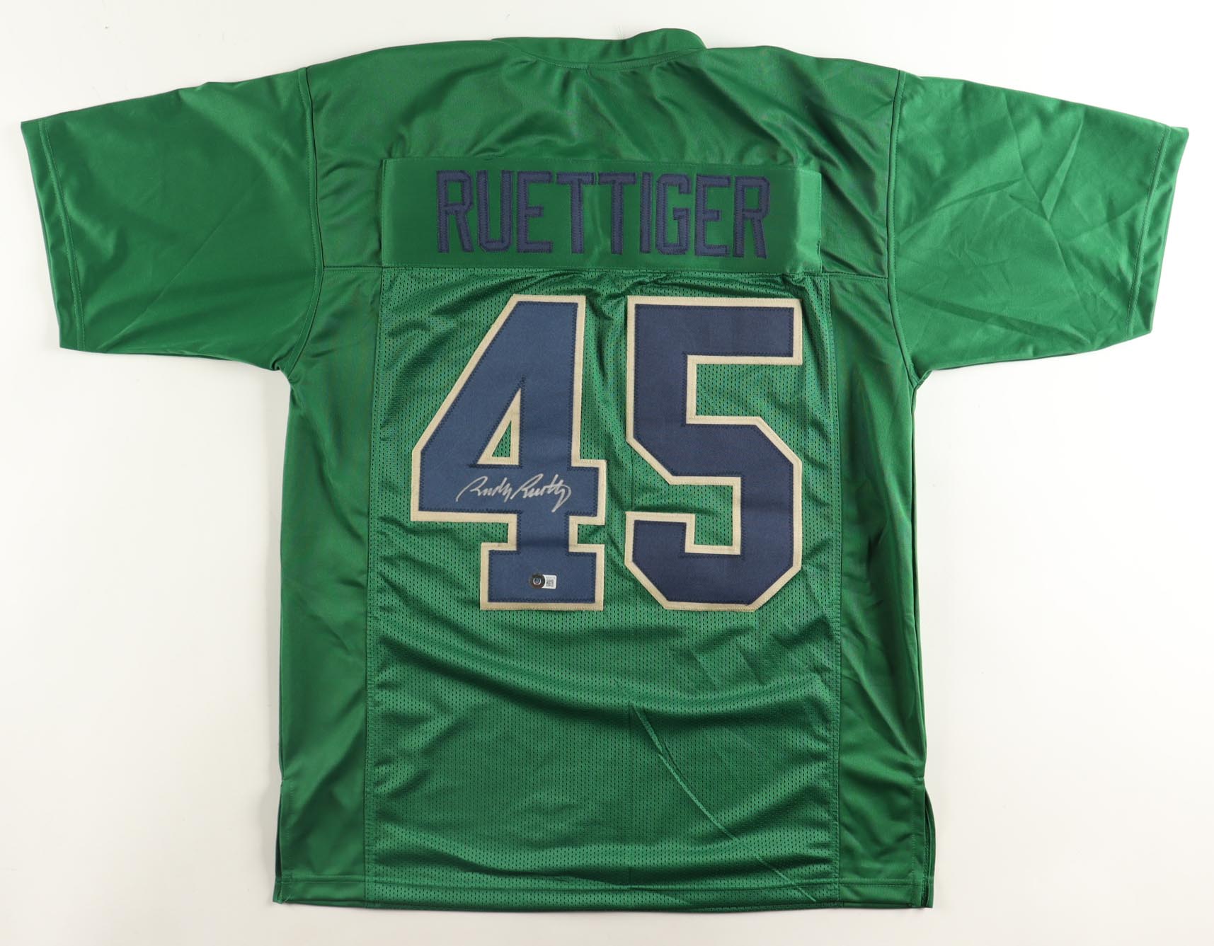 Custom jersey with everything sewn on, size XL. Hand-signed by Rudy Ruettiger.