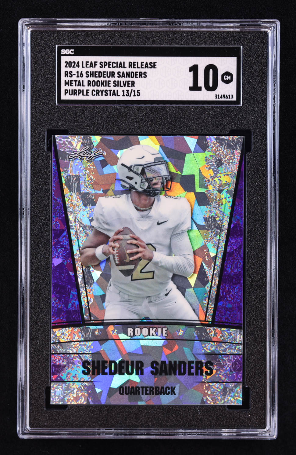 Shedeur Sanders 2024 Leaf Metal Special Release Rookie Silver Crystal Purple #RS16 RC #/15 (SGC 10)