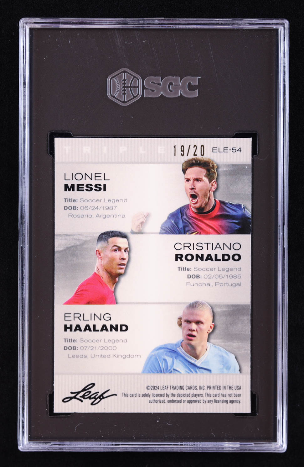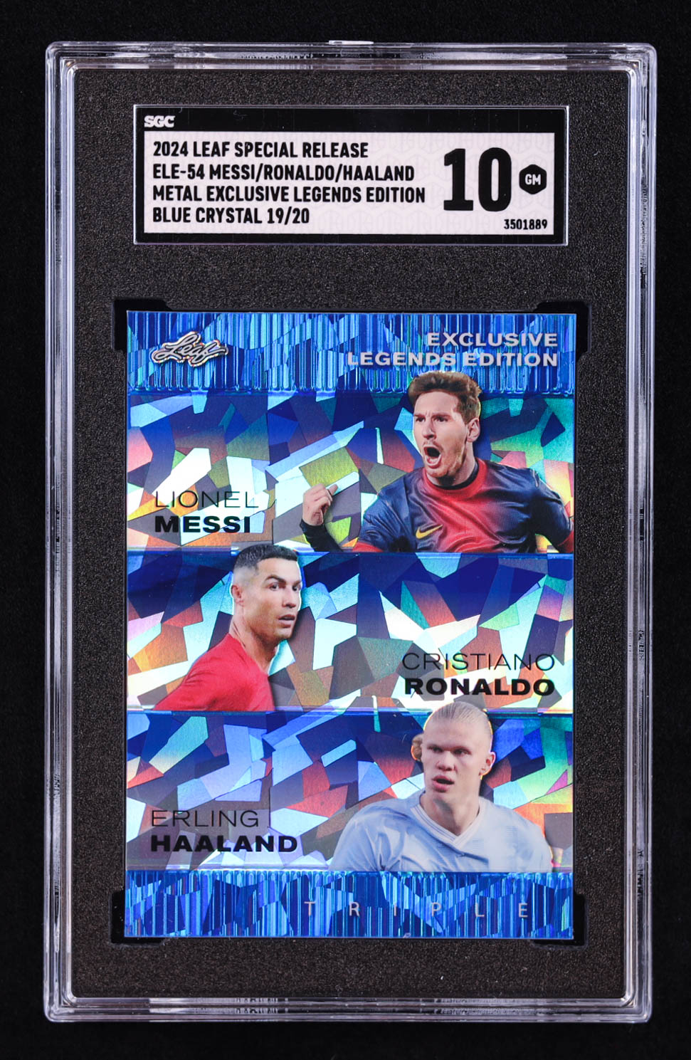 Lionel Messi / Cristiano Ronaldo / Erling Haaland 2024 Leaf Metal Special Release Exclusive Legends Edition Crystal Blue #ELE54 #19/20 (SGC 10)