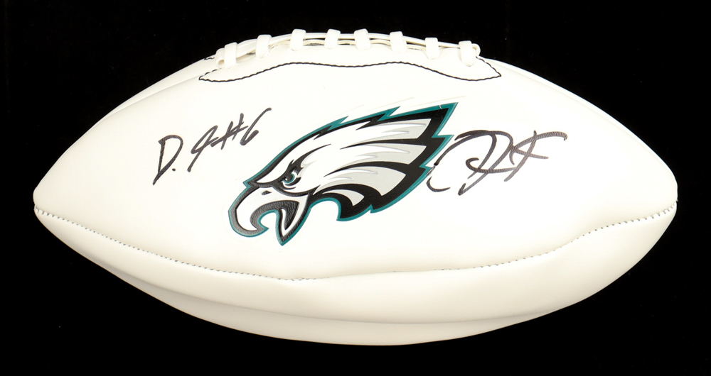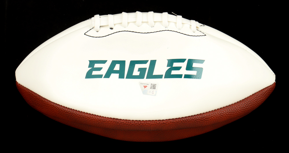 Philadelphia Eagles logo football. Hand-signed by Jalen Hurts and DeVonta Smith. Please note, the football does not inflate.