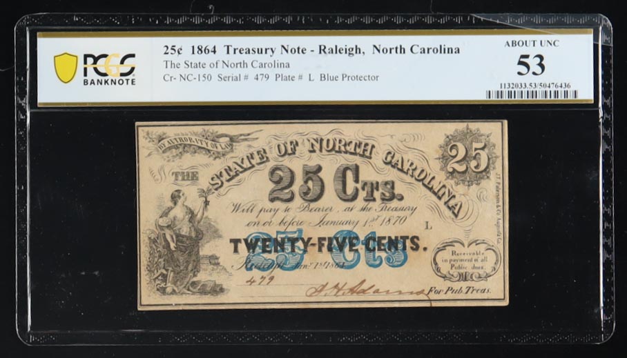 1864 State of North Carolina, Raleigh - $0.25 Treasury Note - Blue Protector (PCGS About Unc 53)