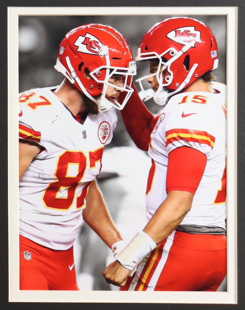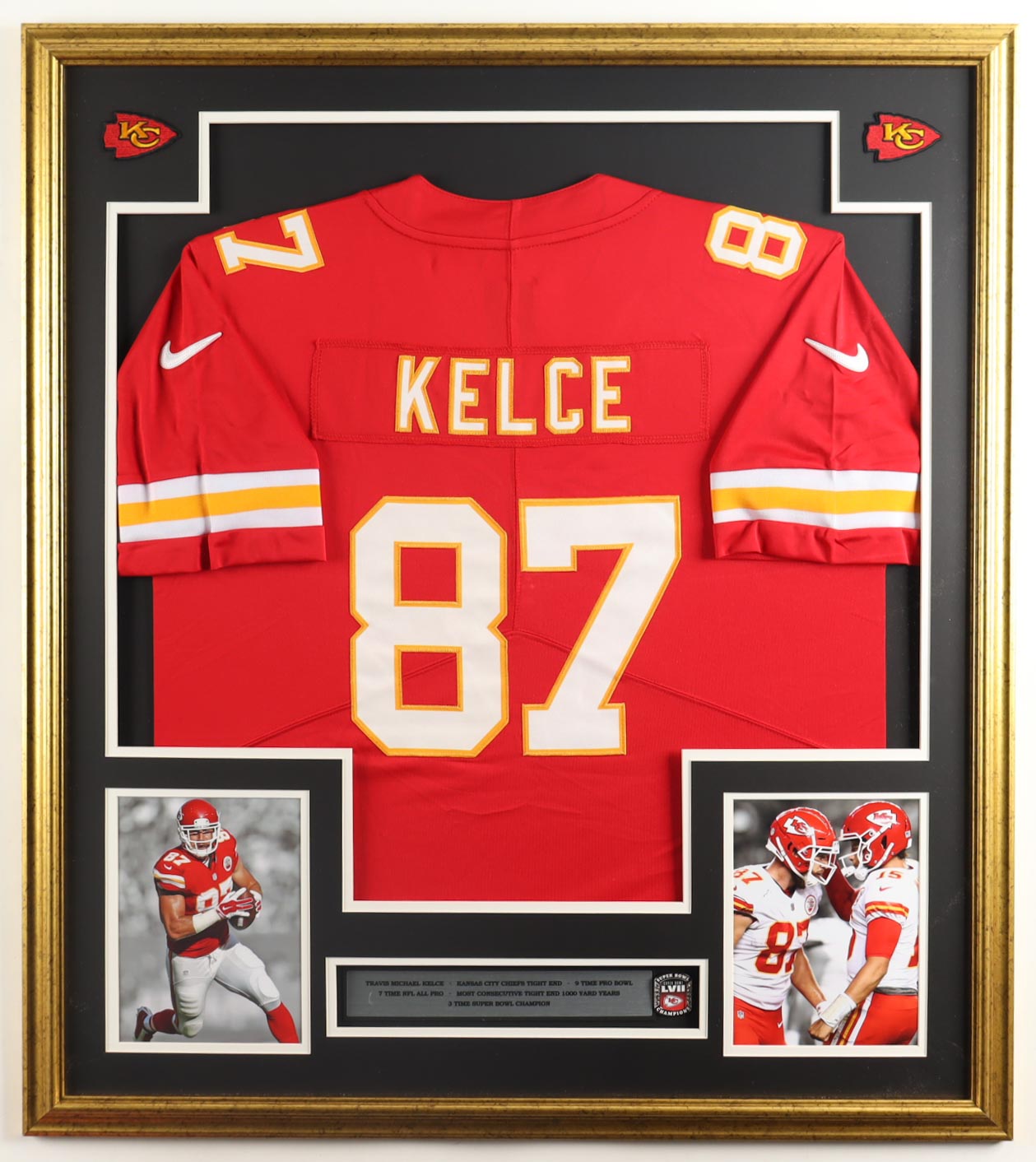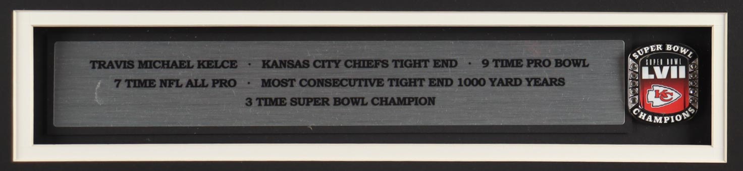 Custom frame measures approximately 33" x 37" in size and features a custom jersey that is unsigned for Travis Kelce. The display also includes a Super Bowl LVII Champions pin and (2) cloth team logo patches. Please note, the display is unsigned.