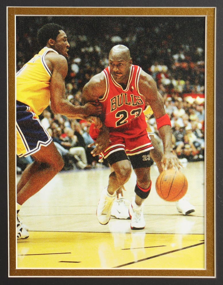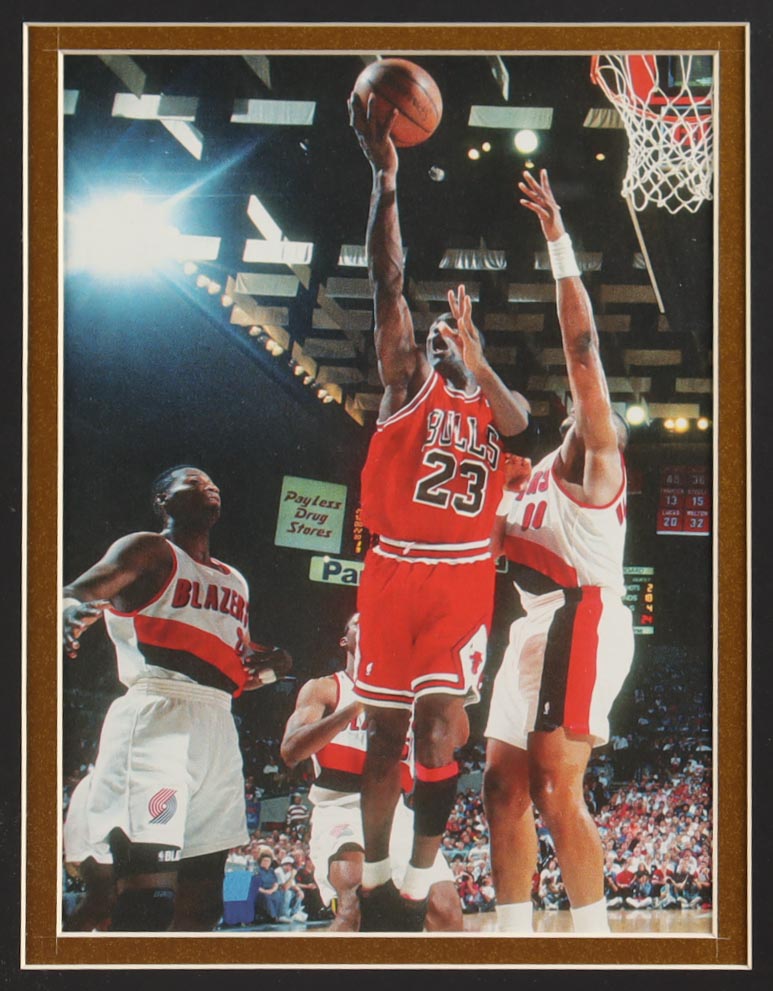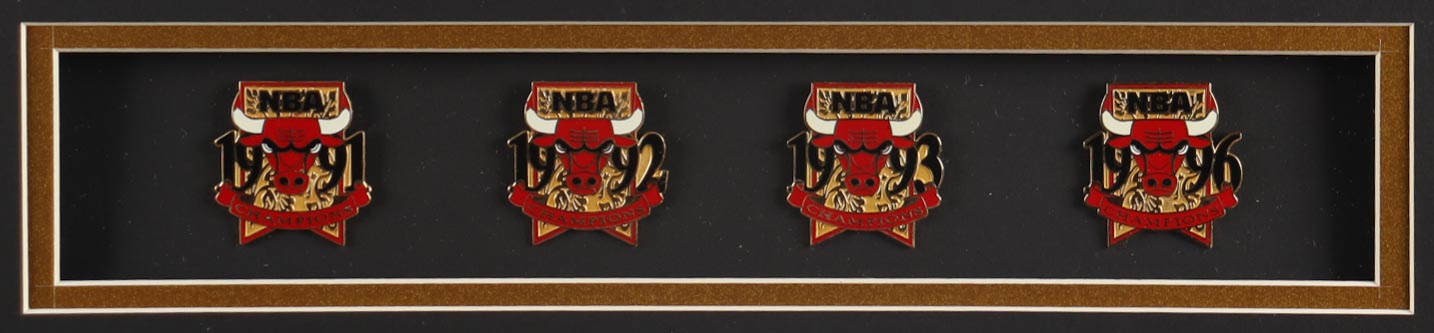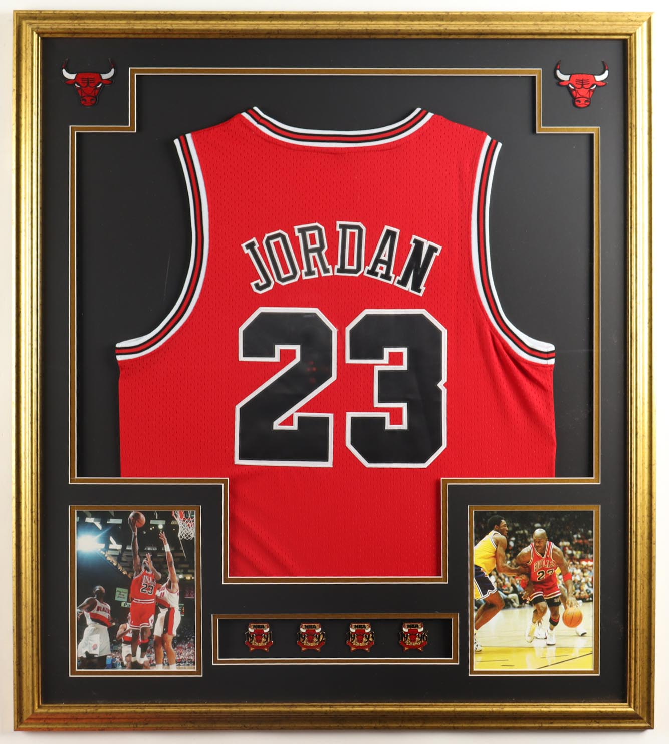 Custom frame measures approximately 33" x 37" in size and features an unsigned Michael Jordan (HOF) jersey. The display also includes 1991, 1992, 1993, 1996 NBA Championship Pins, (2) Photos and (2) cloth team logo patches. Please note, the display is unsigned.