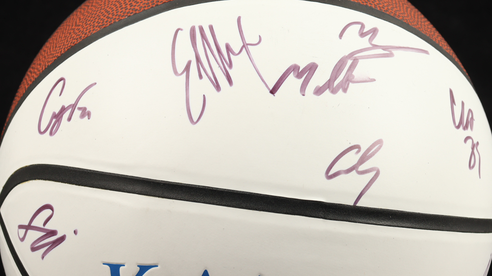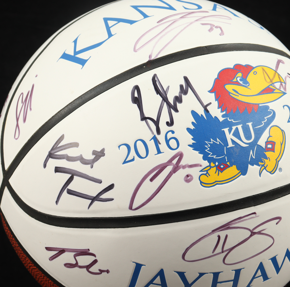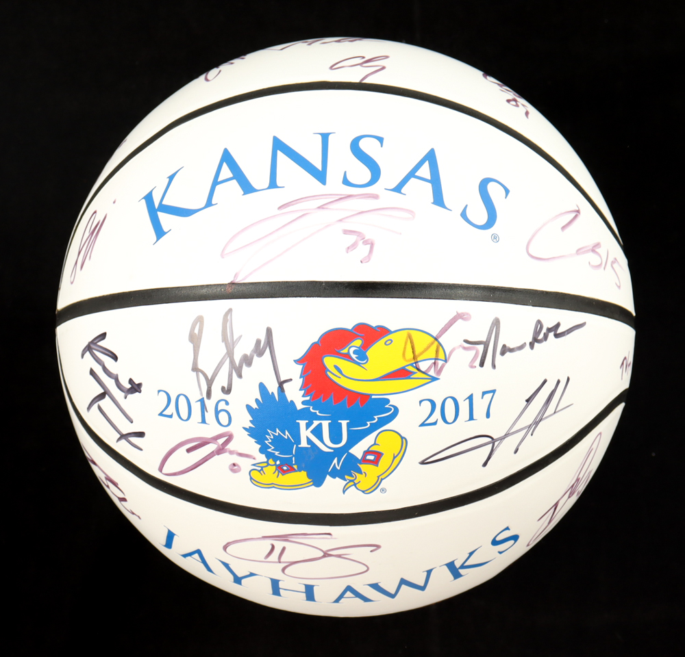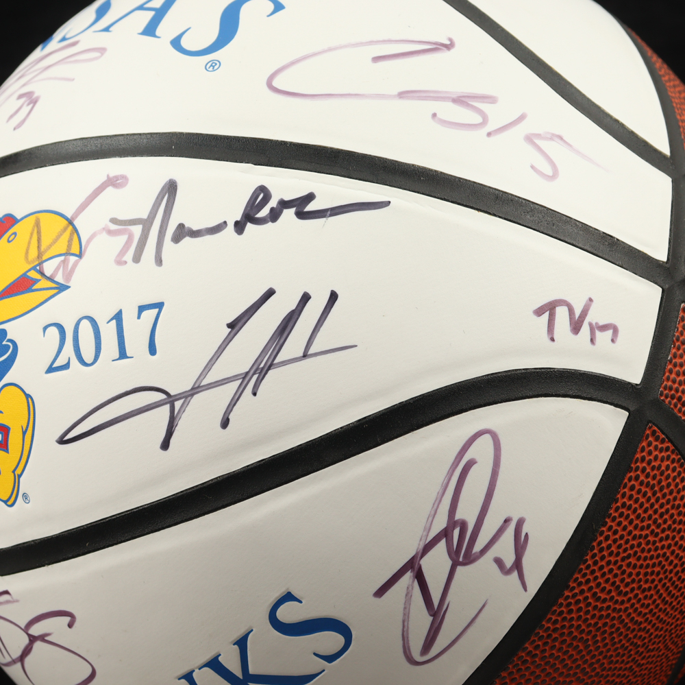 Wilson Kansas Jayhawks logo NCAA basketball. Hand-signed by Bill Self, Frank Mason, Josh Jackson, Devonte Graham, Sviatoslav Mykhailiuk, Dwight Coleby and (13) others. Refer to photos for more details.