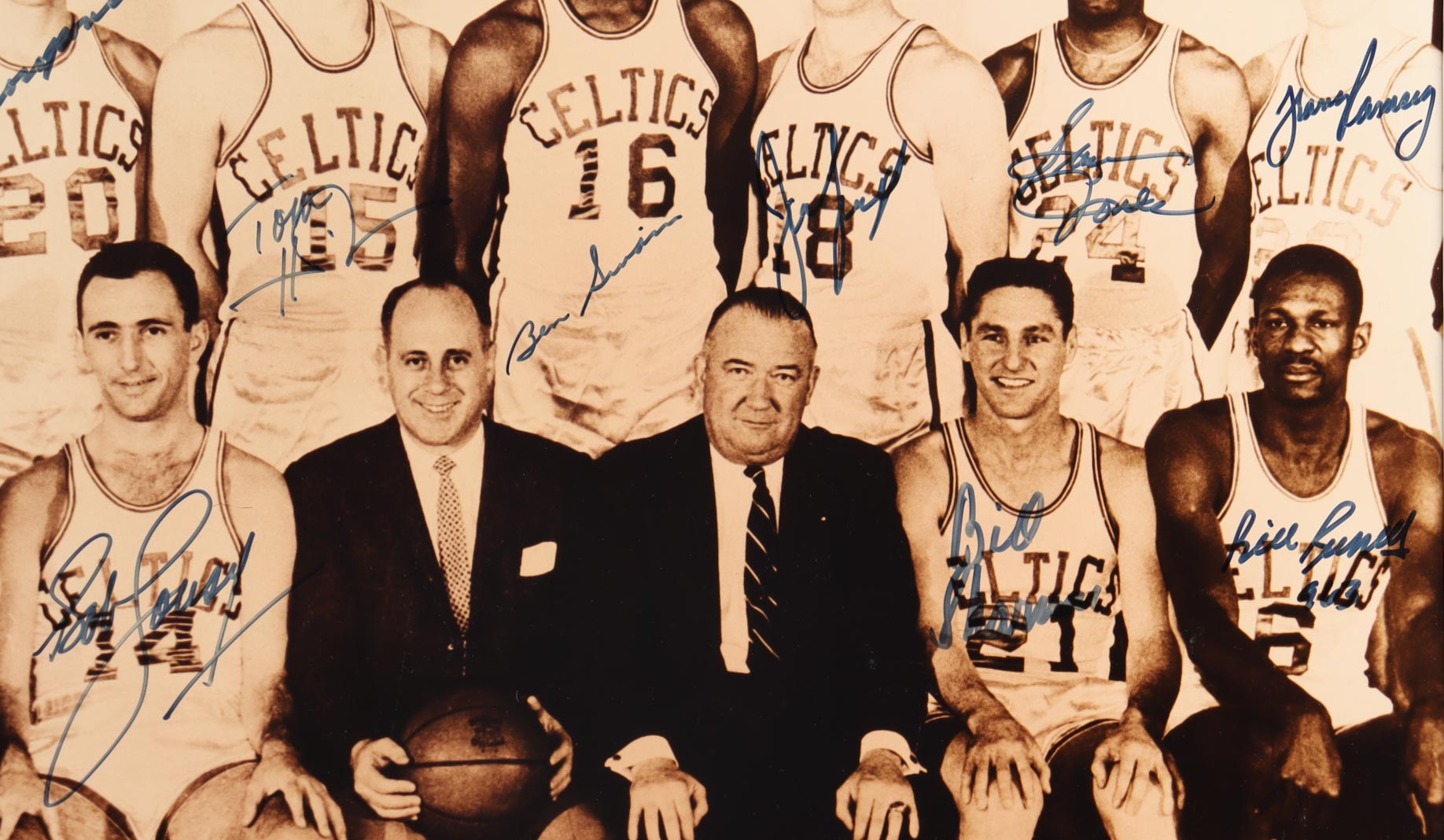Custom matted display measures approximately 25" x 29" in size. Features a photo that has been hand-signed and inscribed by (12) with Bill Russell, Red Auerbach, Bob Cousy, Sam Jones, Tommy Heinsohn, Bill Sharman, K.C. Jones, Gene Conley, Frank Ramsey, Buddy LeRoux, Lou Tsioropoulos and Ben Swain. Please note, there is some scuffing on the display and corner wear on the mat board.