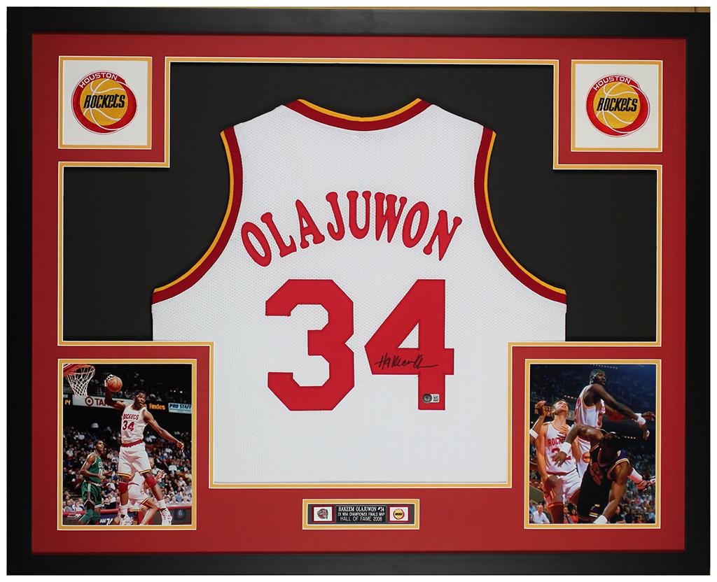 Custom frame measures 35" x 43" in size and features a jersey that has been hand signed by Hakeem Olajuwon (HOF).
