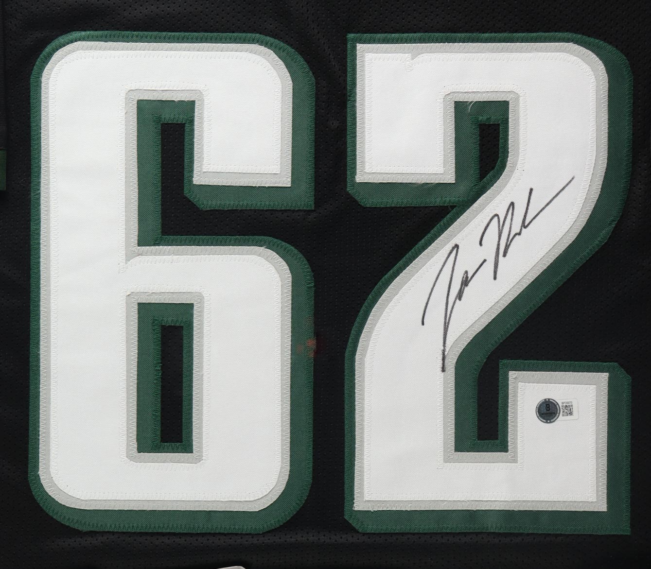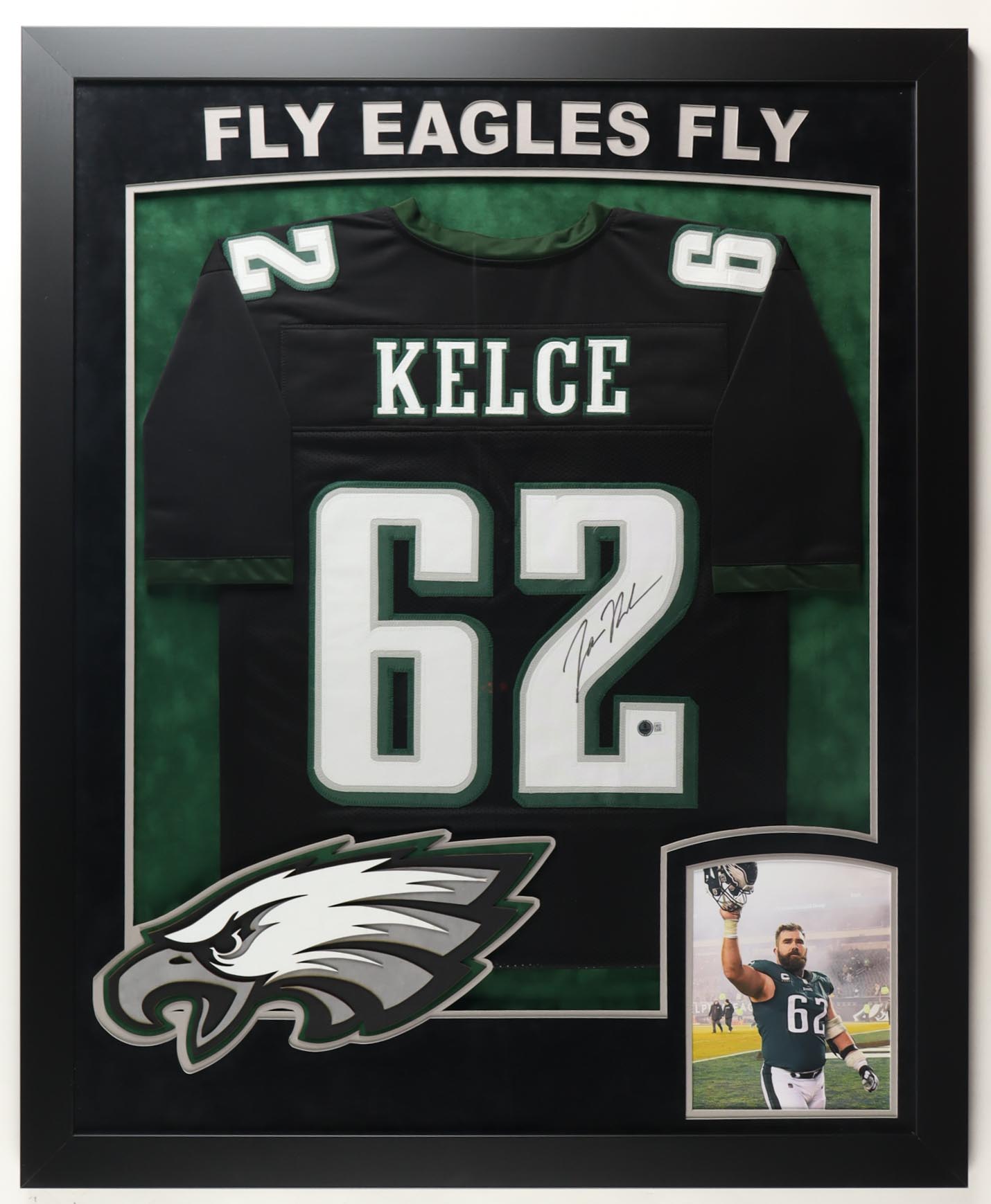 Custom frame measures approximately 35" x 43" in size and features a custom jersey that has been hand-signed by Jason Kelce.