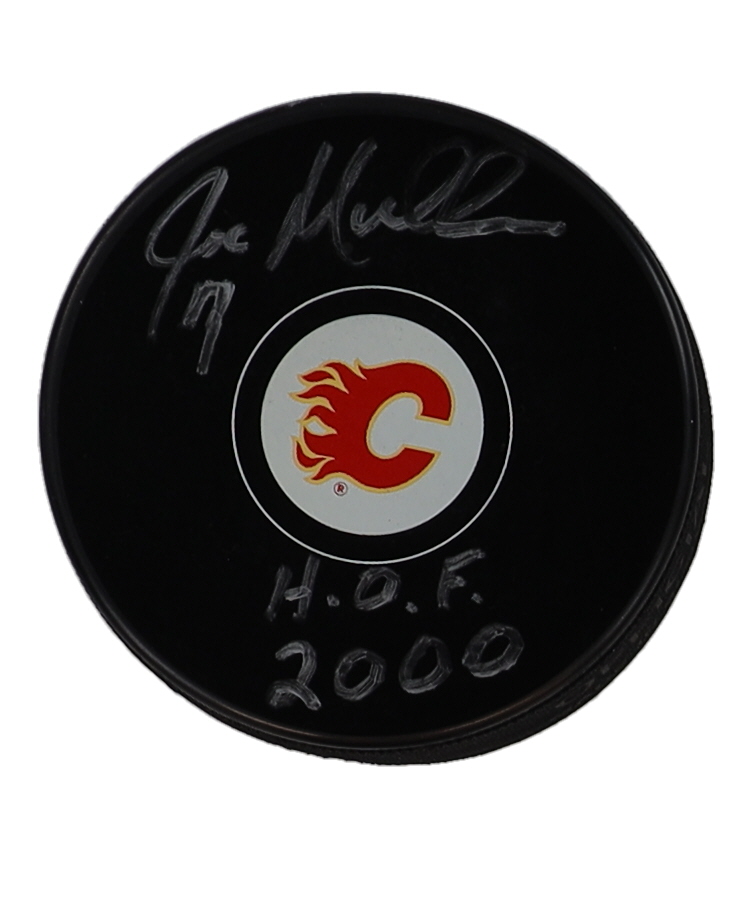 Joe Mullen Signed Flames Logo Hockey Puck Inscribed "H.O.F. 2000" (JSA)