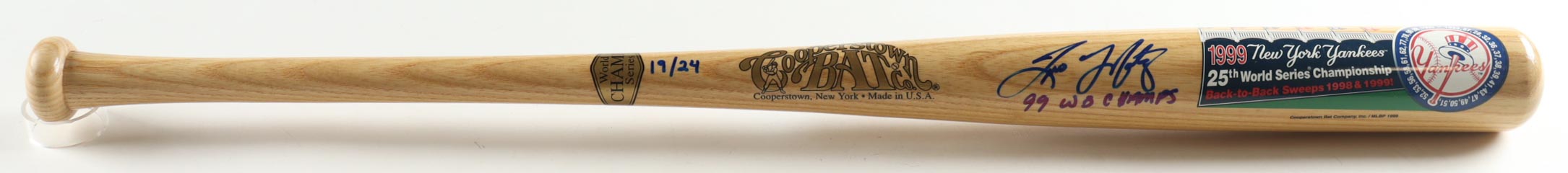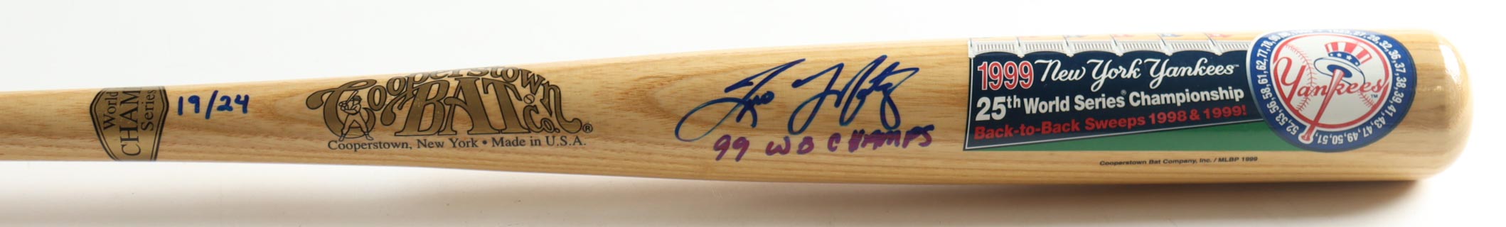 Cooperstown 1999 New York Yankees World Series Champs baseball bat has been hand-signed and inscribed by Tino Martinez (New York Yankees). The bat is limited edition and is numbered #19/24.