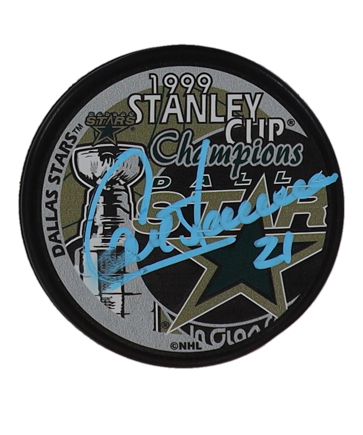 Dallas Stars 1999 Stanley Cup Champions Logo Hockey Puck. Hand-signed by Guy Carbonneau (HOF). Please note, the signature has been smudged.
