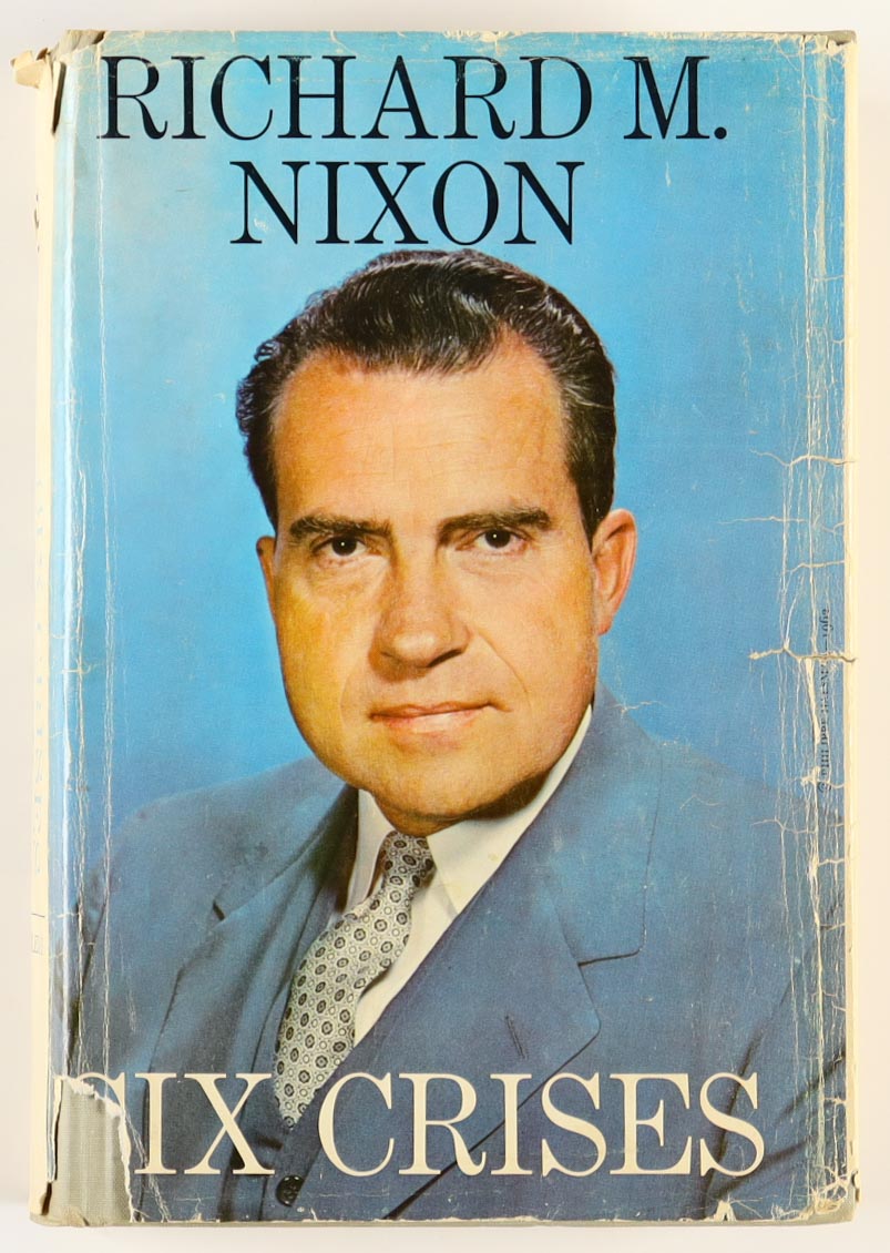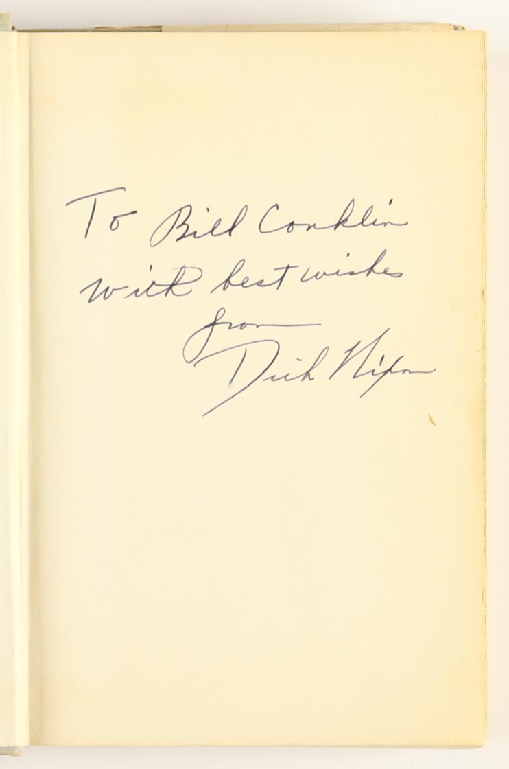 Hardcover book has been hand-signed and inscribed by Richard Nixon (D. 1994). Please note the book shows heavy signs of damage and is made out to "Bill"