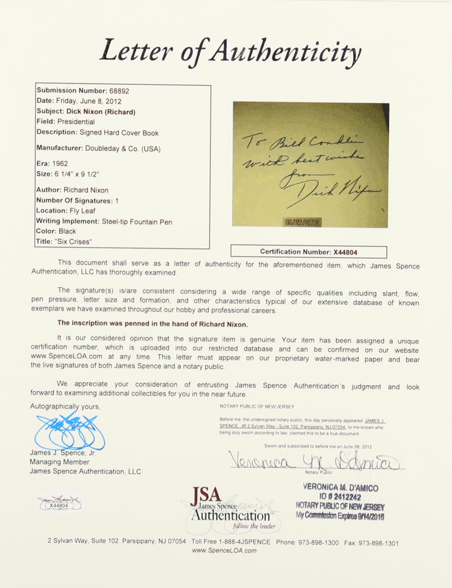 Richard Nixon Signed "Six Crises" Hardcover Book Inscribed "With Best Wishes" (JSA)
