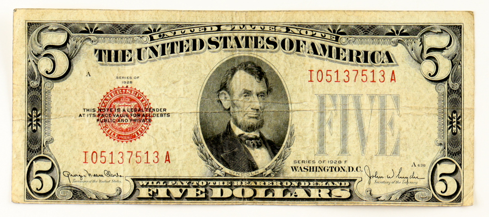 1928-F United States Red Seal $5 Five Dollar Bank Note