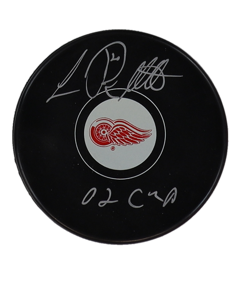 Luc Robitaille Signed Red Wings Logo Hockey Puck Inscribed "02 Cup" (COJO)