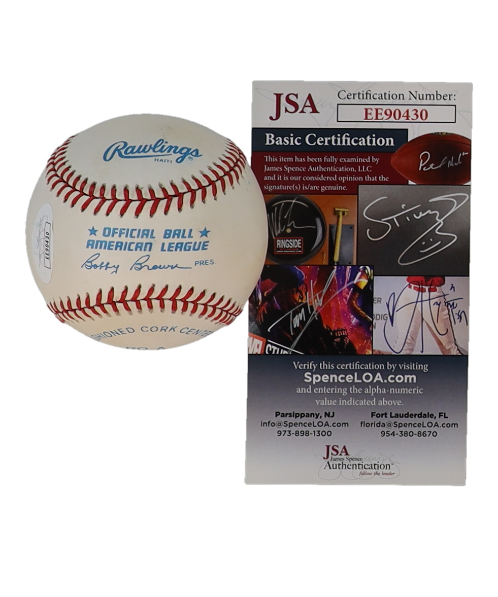 Rawlings Official American League Baseball. Hand-signed and inscribed by Ron Guidry (New York Yankees). Please note, the baseball is naturally toning and stained.