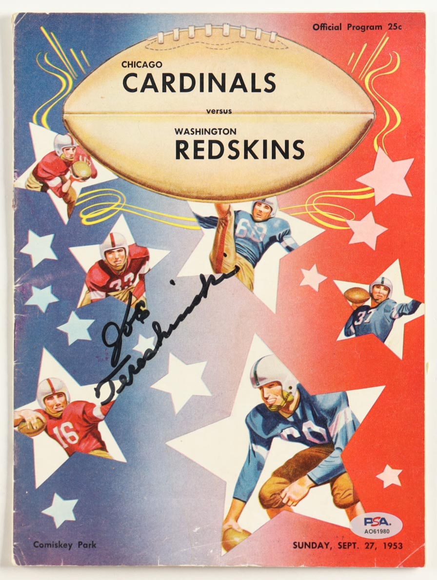 Vintage Chicago Cardinals Vs Washington Redskins Official Game Program dated September 27, 1953. Hand-signed by Joe Tereshinski Sr. (D. 2013, Washington Redskins). Please note, there is scuffing, edge and corner wear.
