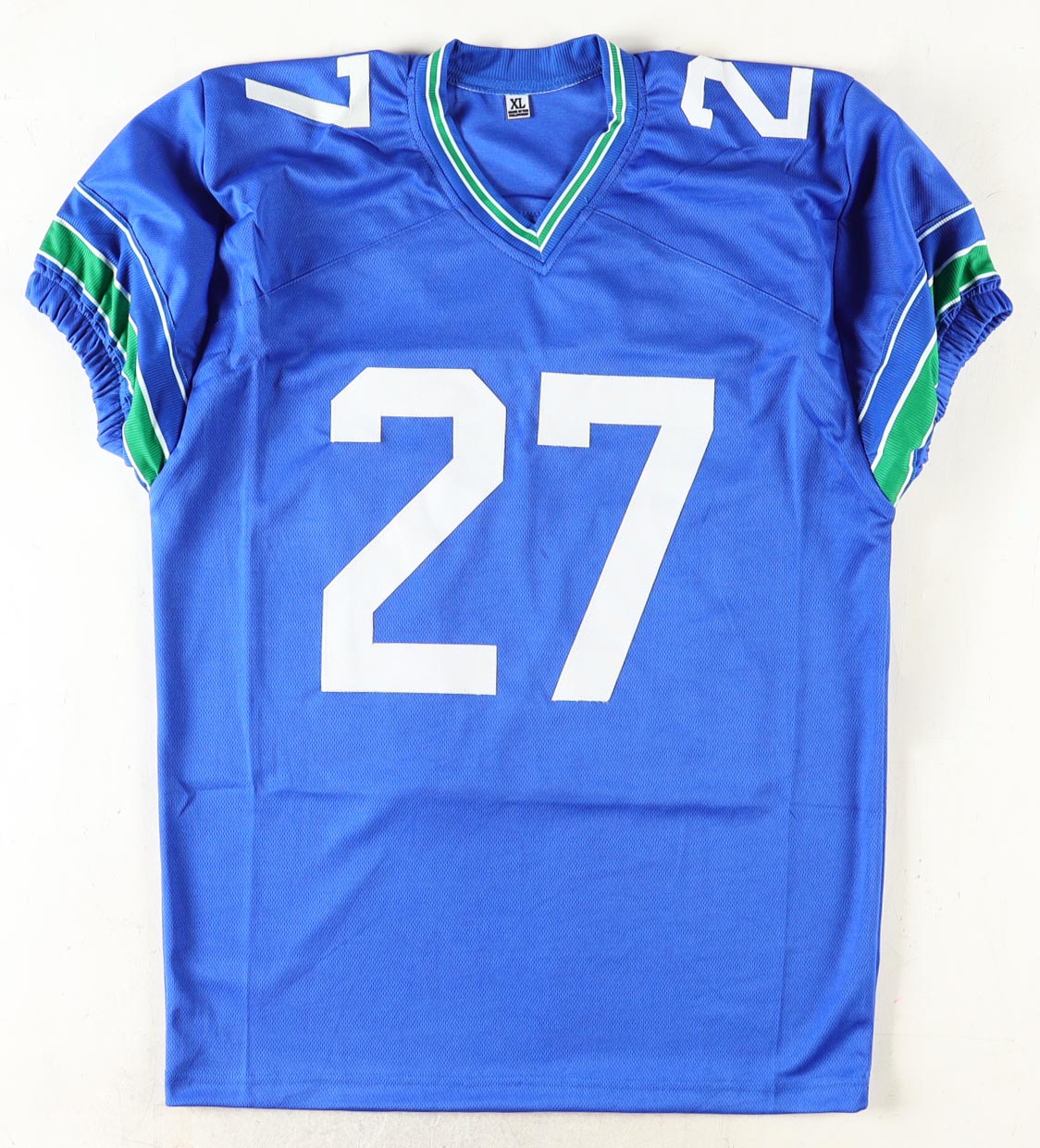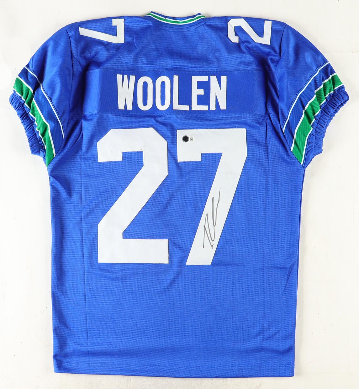 Custom jersey with everything sewn on, size XL. Hand-signed by Tariq Woolen.