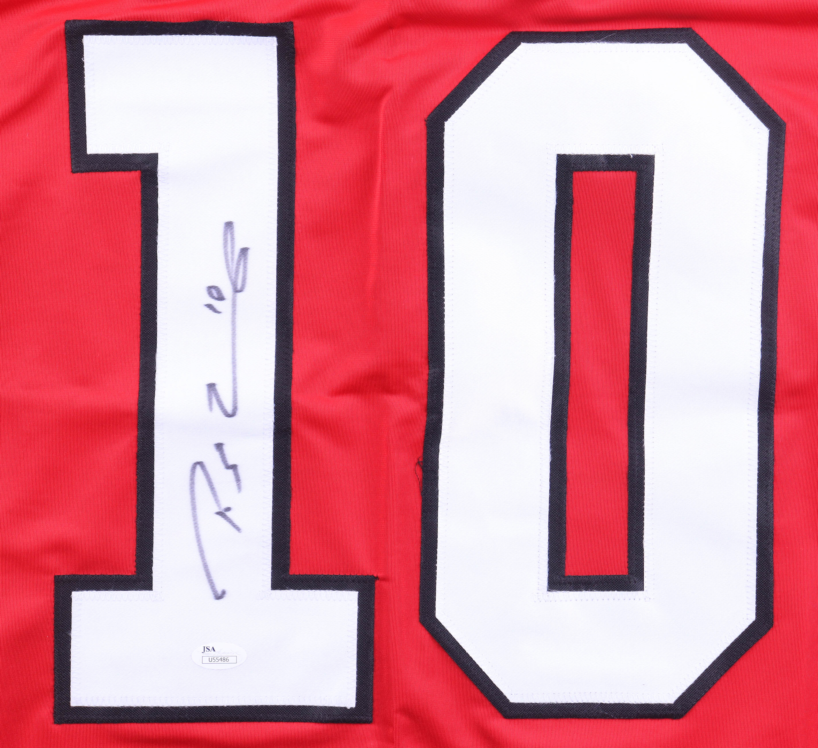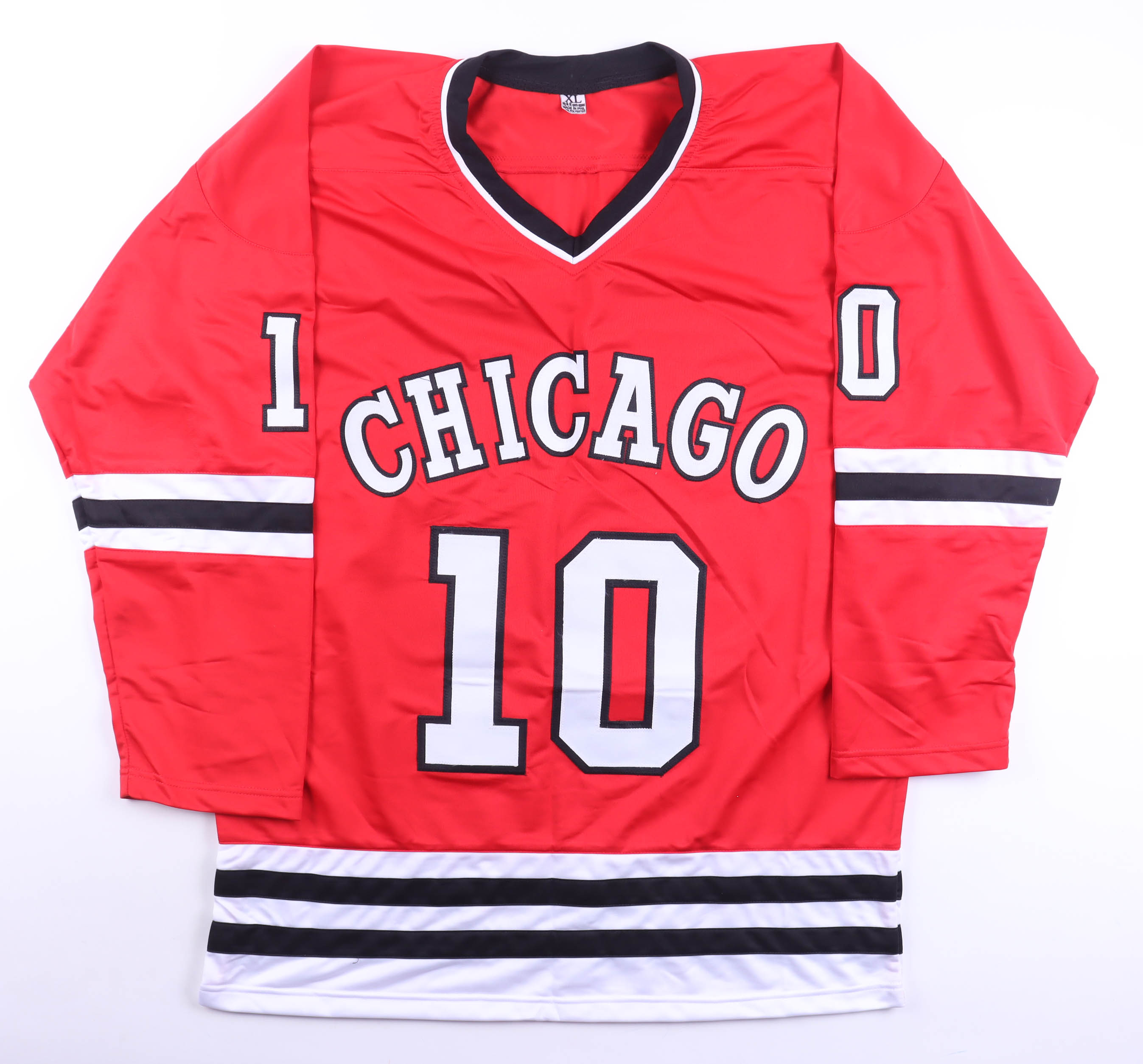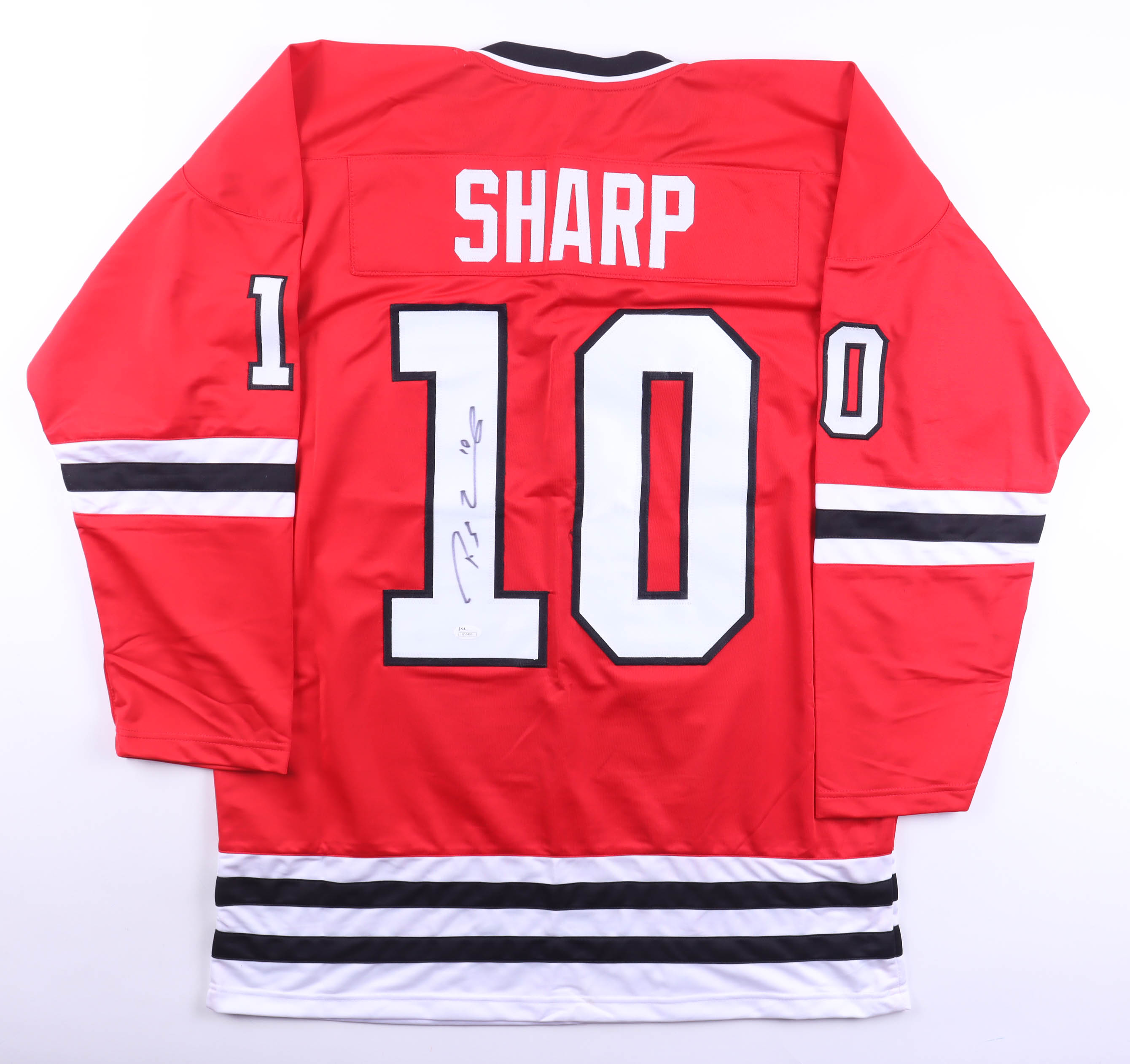 Custom jersey with everything sewn on, size XL. Has been hand-signed by Patrick Sharp. Please note, the signature has bled.