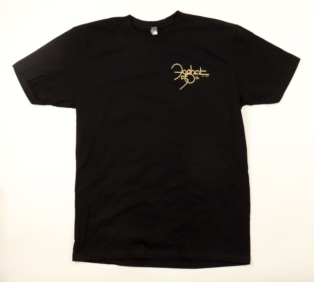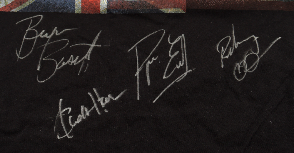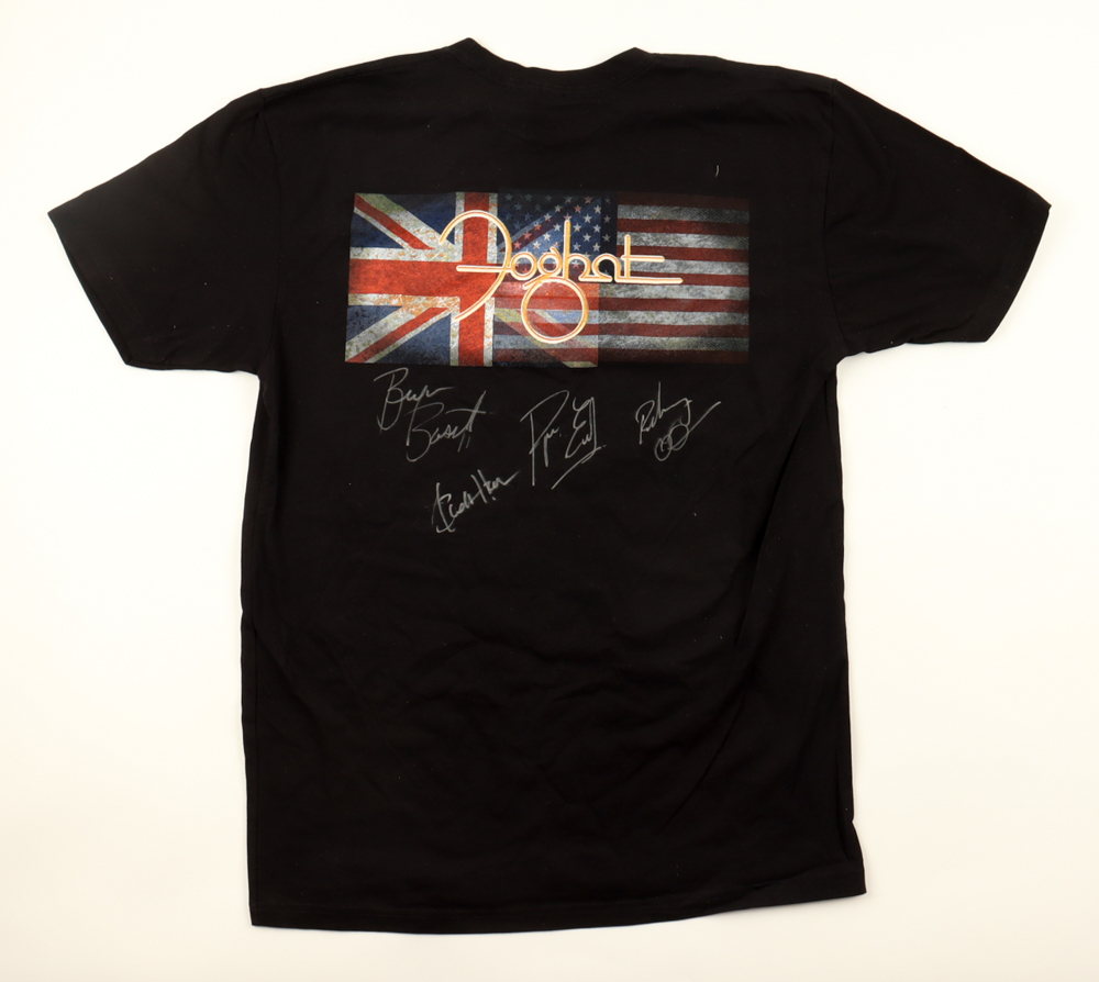 Foghat shirt, size F, has been hand-signed by Bryan Bassett, Charlie Huhn, Rodney O'Quinn, and Roger Earl. Please note, the shirt is stained.