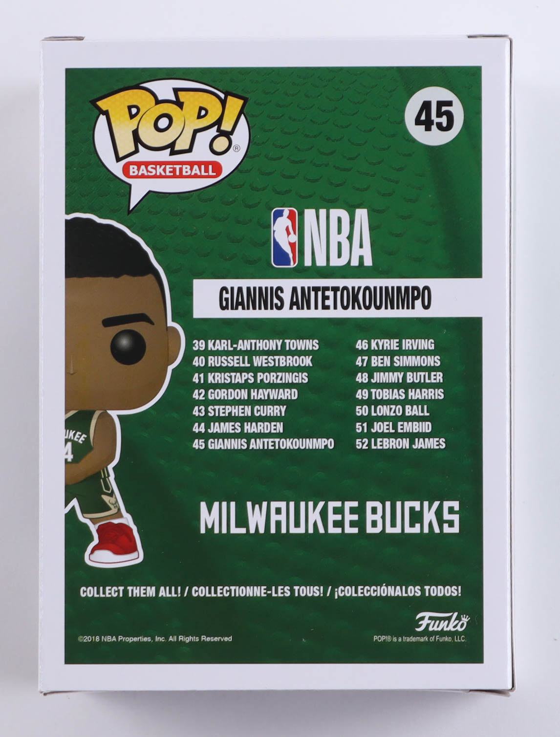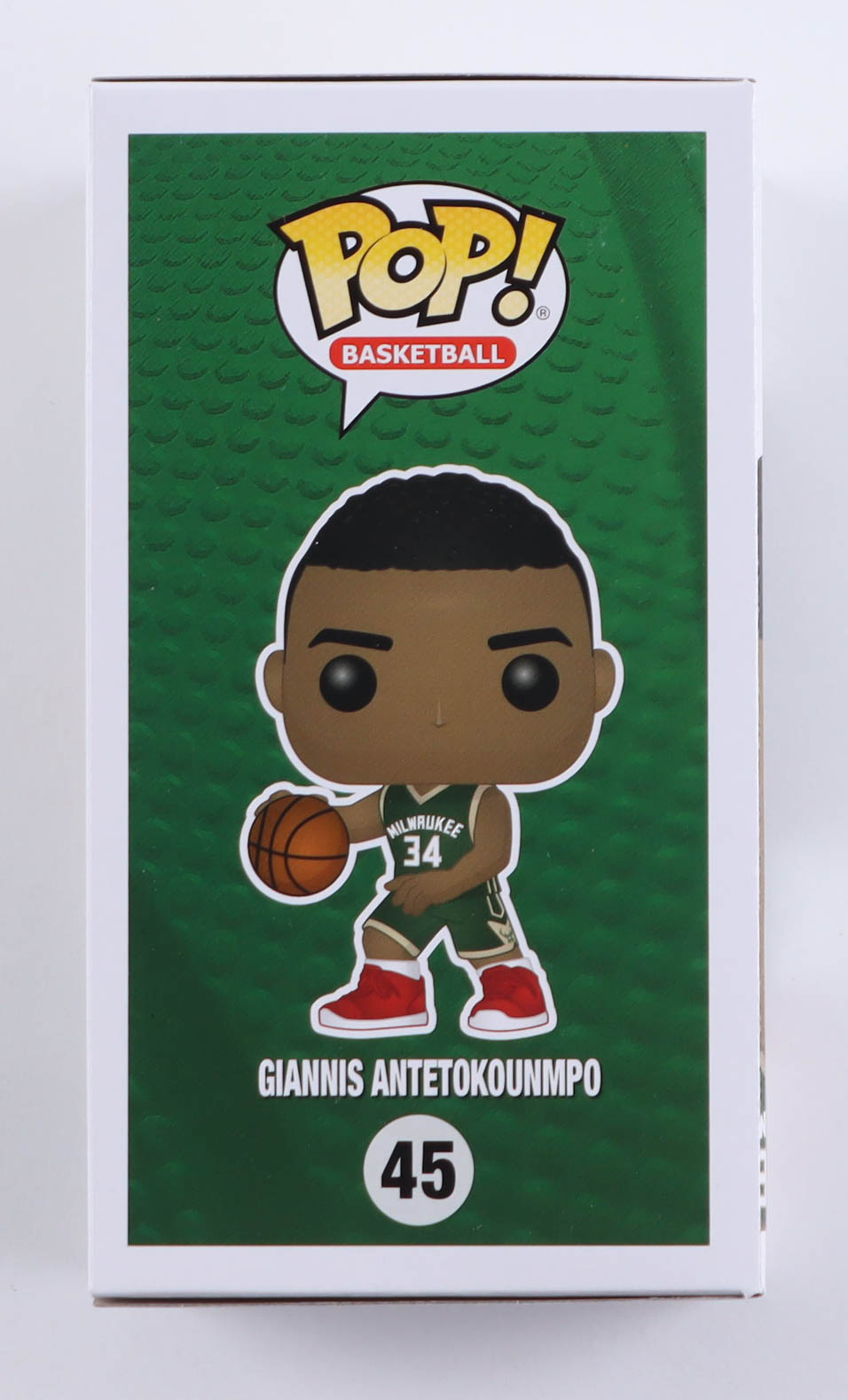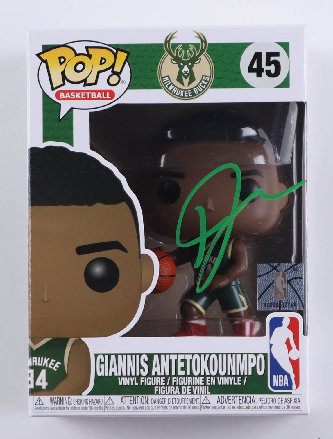 Funko Pop! vinyl figure that measures approximately 4" tall in size and has been hand-signed by Giannis Antetokounmpo (Milwaukee Bucks).