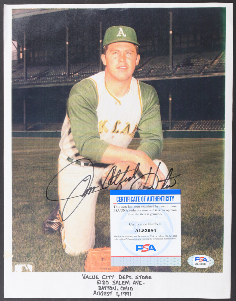 Photo measures approximately 8" x 10" in size and has been hand-signed by Jim Hunter (D. 1999, Oakland Athletics, HOF).