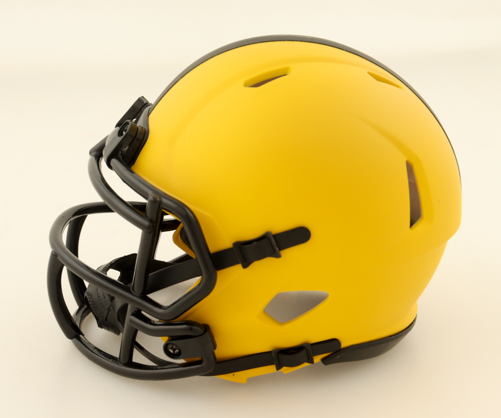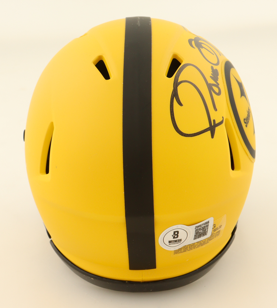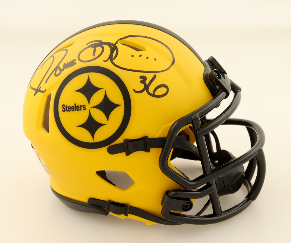 Riddell Pittsburgh Steelers Rave Alternate speed mini helmet has been hand-signed by Jerome Bettis.