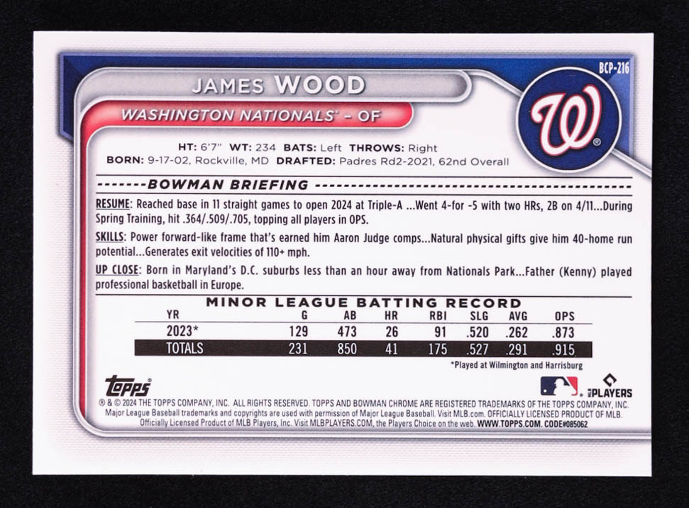 James Wood 2024 Bowman Chrome Sapphire Prospects Gold Refractors #BCP216 #37/50 RC