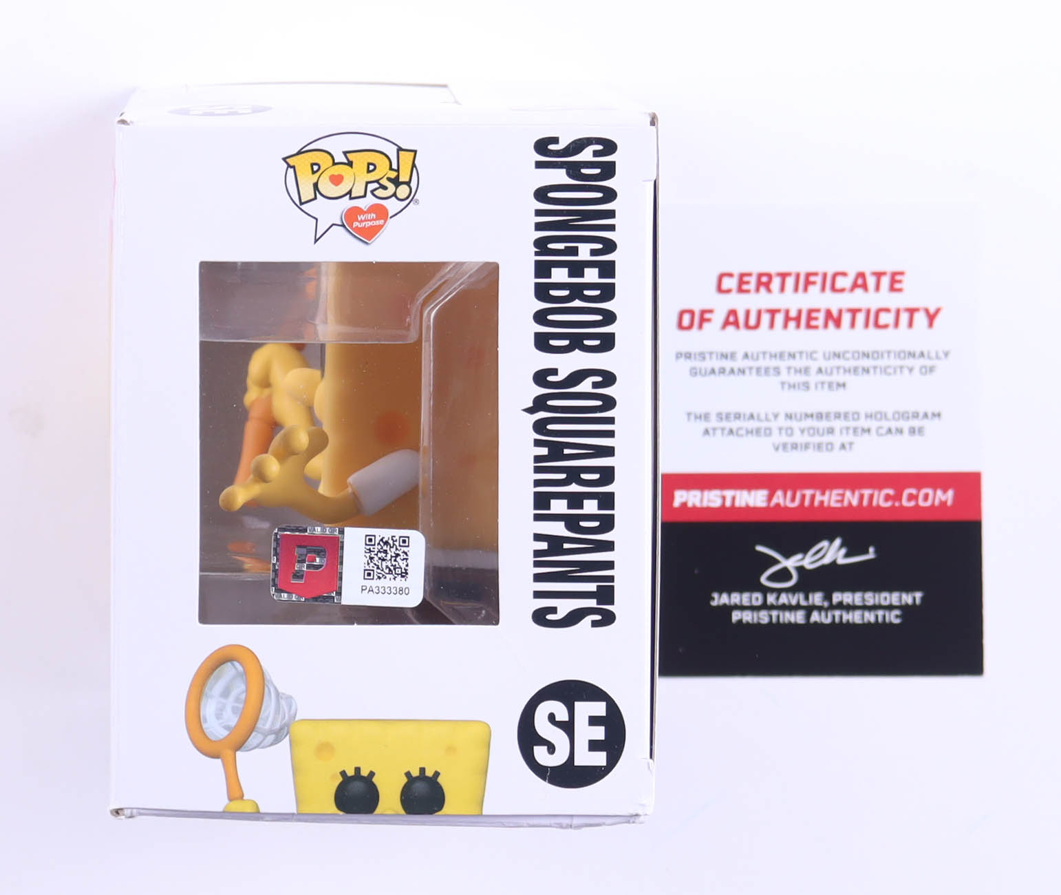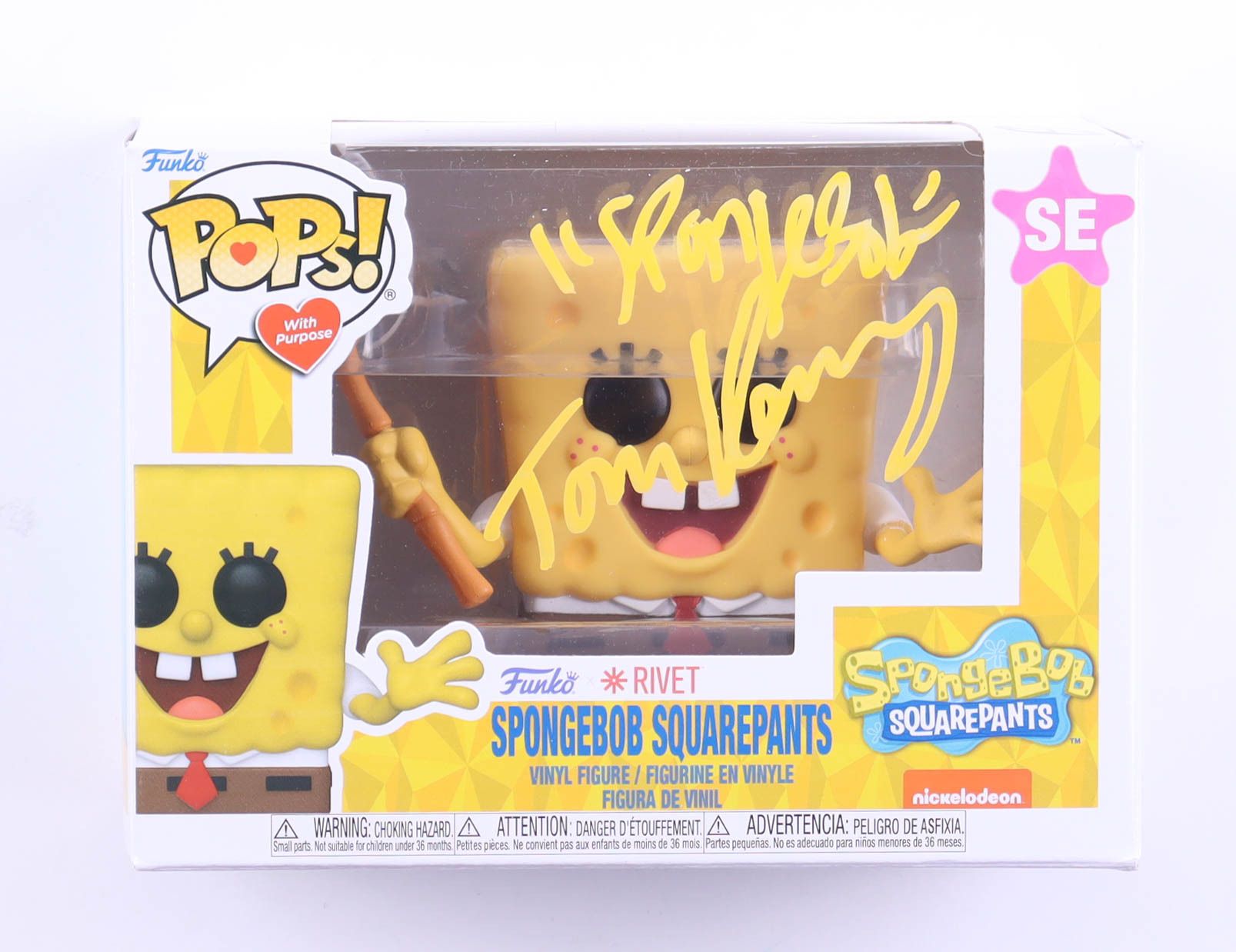 Funko pop! vinyl figure measures approximately 4" tall and has been hand-signed & inscribed on the packaging by Tom Kenny. Please note, creasing on the rear bottom corner.