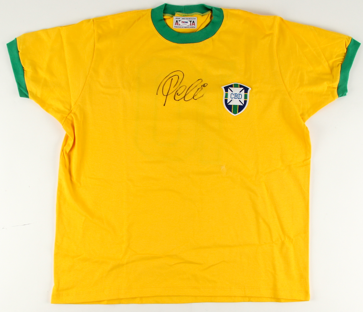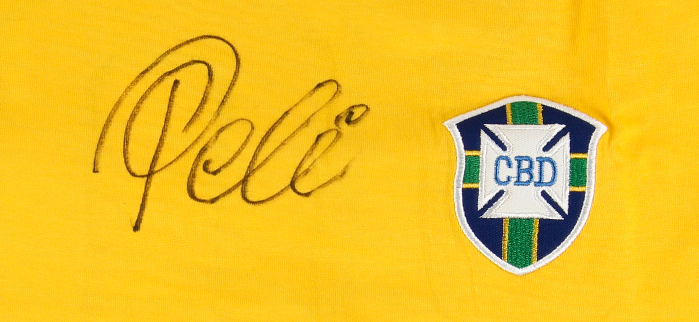 Team Brazil authentic Pele 1970 World Cup Finals jersey manufactured by Athleta. Everything is sewn on. Hand-signed in black felt-tip pen by Pele.
