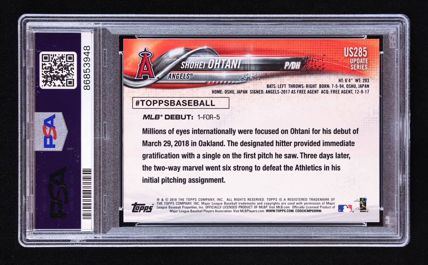 Shohei Ohtani 2018 Topps Update #US285 RD RC (PSA 10)