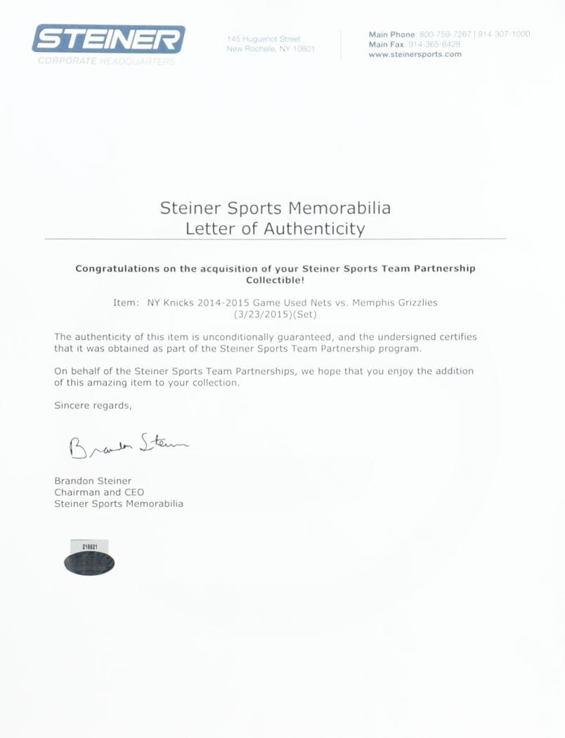 Game used nets used by the New York Knicks in Madison Square Garden. The nets were game used on March 23rd, 2015 in a game against the Memphis Grizzlies.