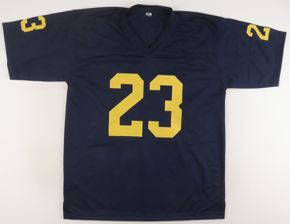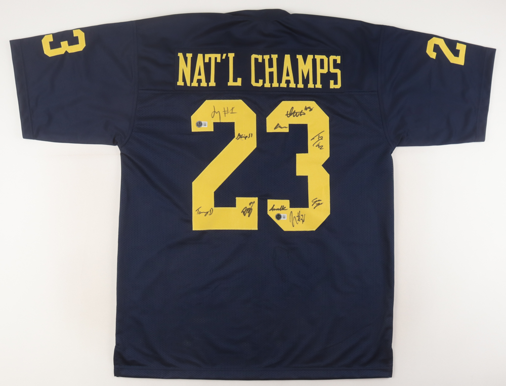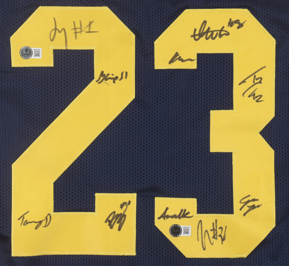 Custom jersey with everything sewn on, size XL. Team-signed by (10) members of the Michigan Wolverines, including Tommy Doman, Ja'Den Mcburrows, Greg Crippen, Zeke Berry, Keshaun Harris, Giovanni El-Hadi, TJ Guy, Joe Taylor, Jimmy Rolder and Amorion Walker. Please note, some signatures have bled.