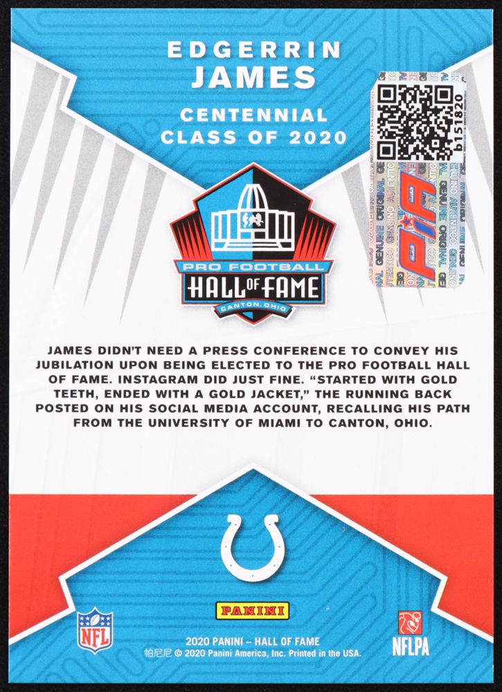 Edgerrin James Signed 2020 Panini Hall Of Fame #NNO Inscribed "HOF 20'" (PIA)