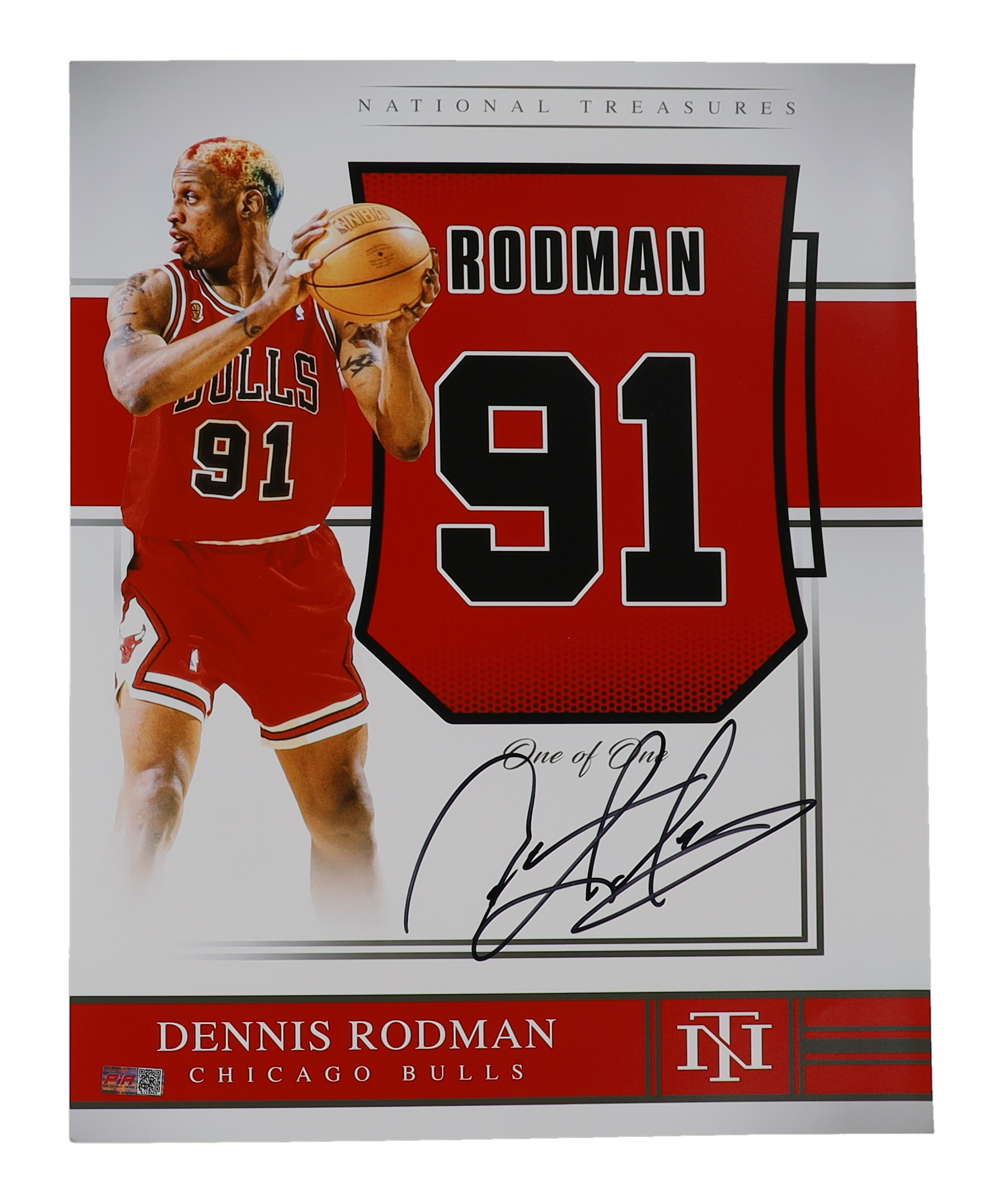 Photo measures 16” x 20” in size and has been hand-signed by Dennis Rodman (Chicago Bulls, HOF).