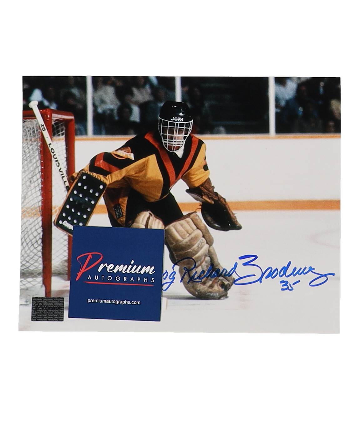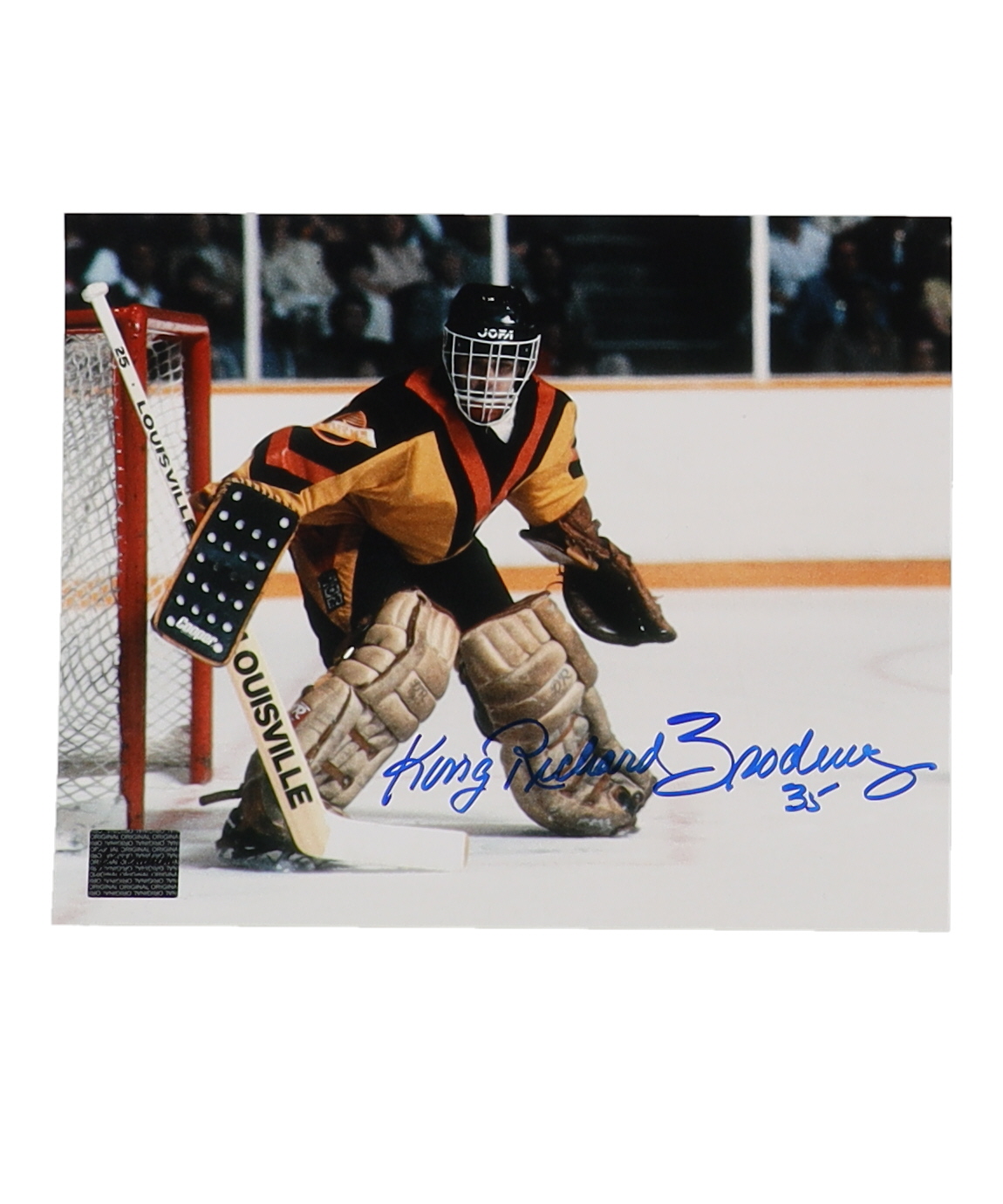 Photo measures 8" x 10" in size and has been hand-signed and inscribed by Richard Brodeur (Vancouver Canucks).