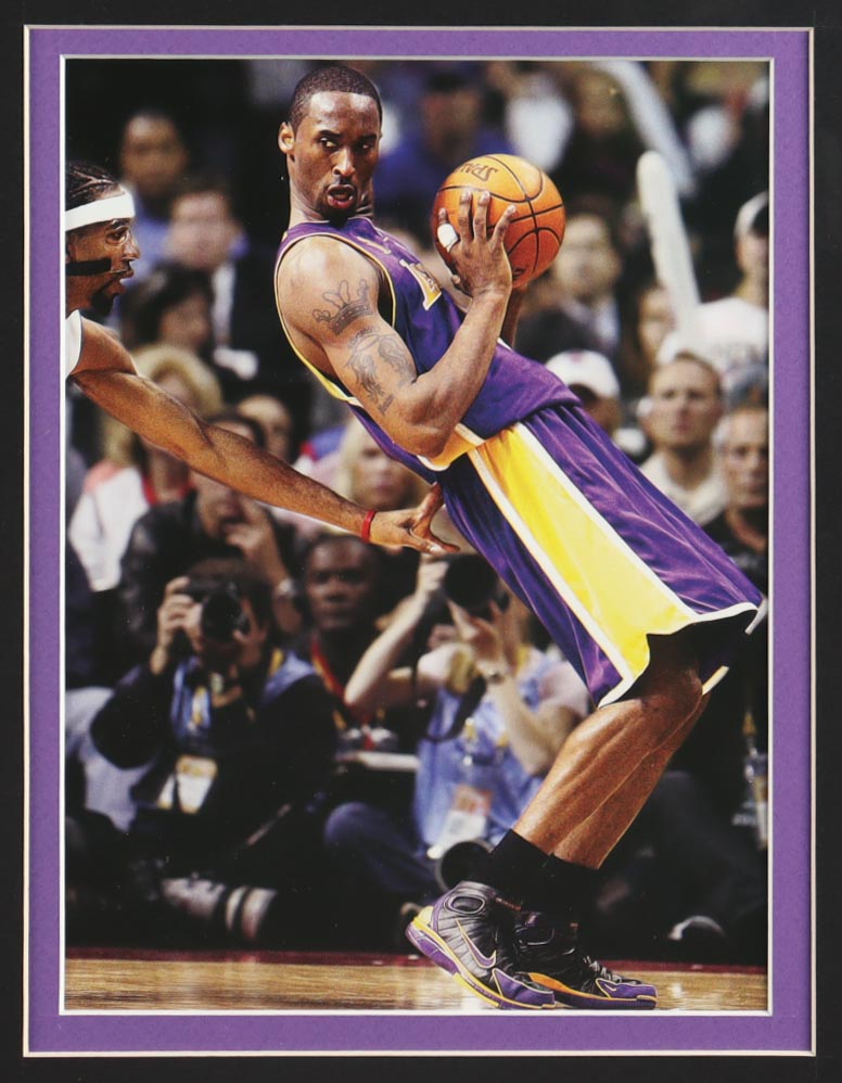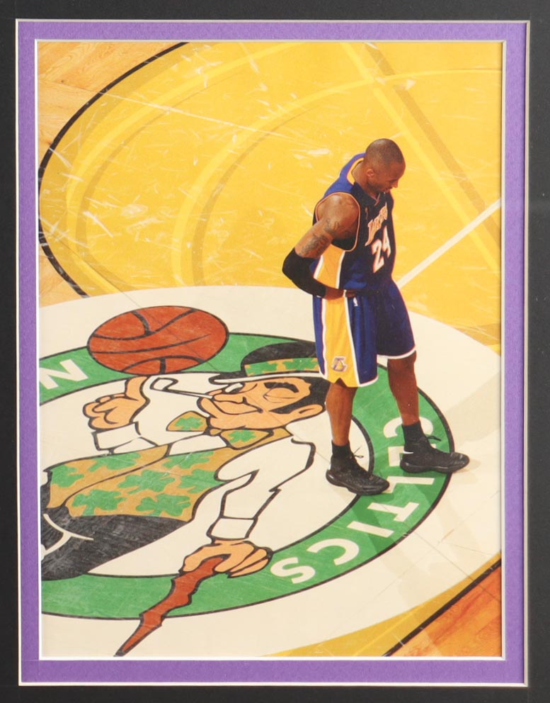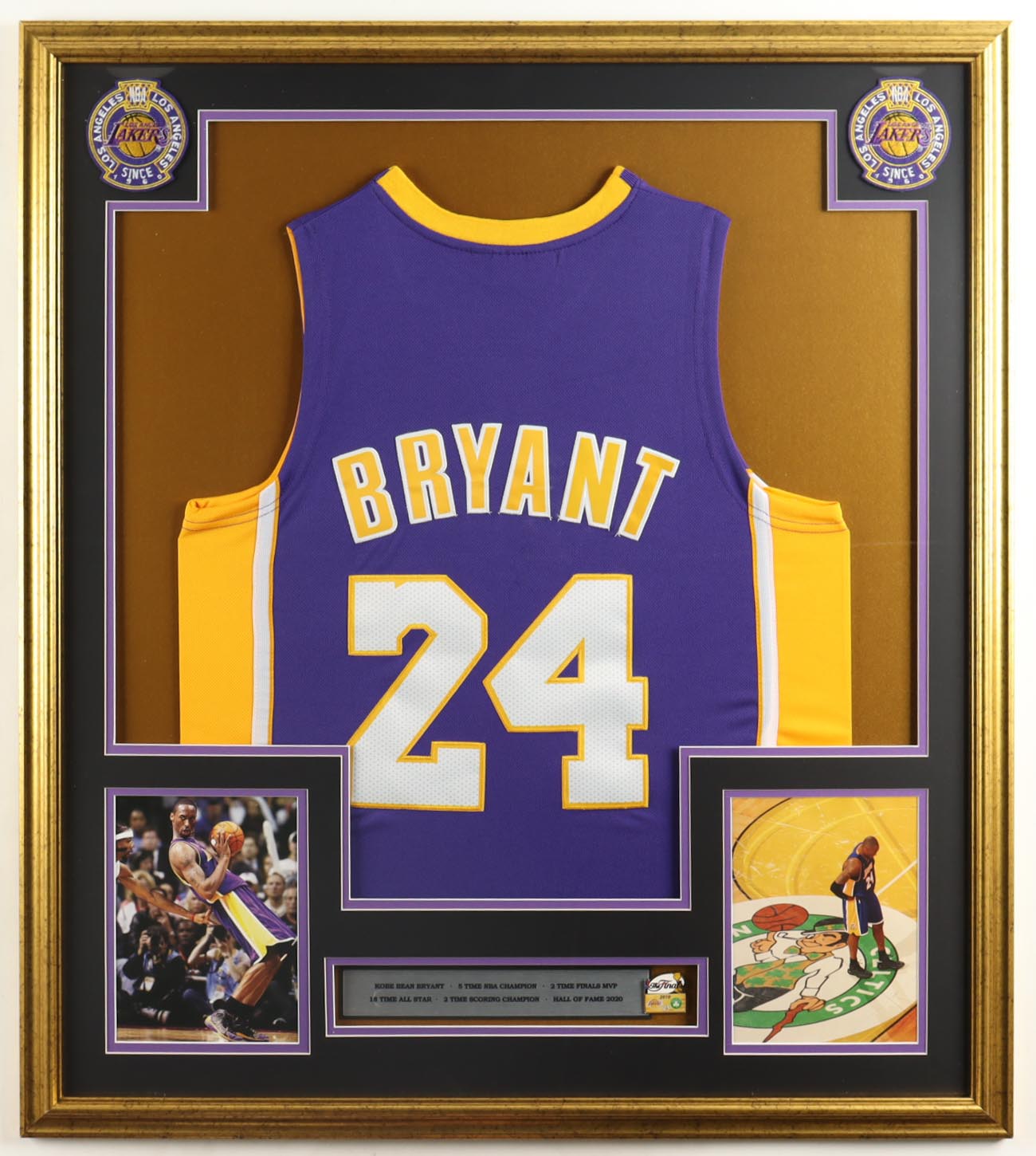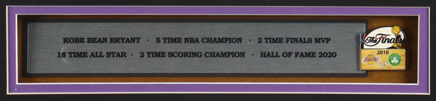 Custom frame measures approximately 33" x 37" in size and features an unsigned Kobe Bryant (D. 2020, Los Angeles Lakers, HOF) Jersey. The display also includes a 2010 NBA Finals Pin, (2) Photos, (2) Team Logo Patches, and a Career Statistics Plaque. Please note, the display is unsigned.
