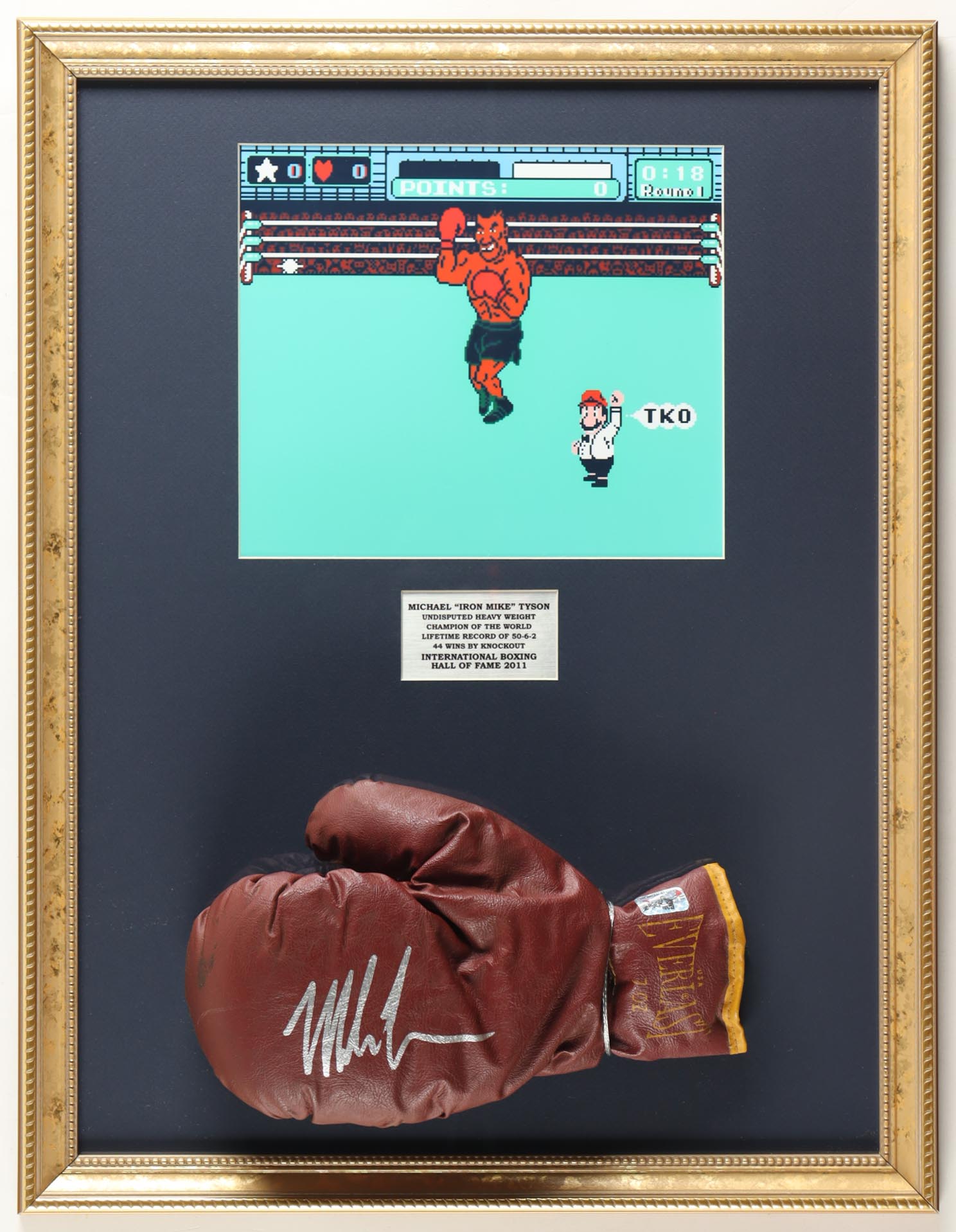 Custom frame measures approximately 17" x 22" in size. Features a vintage Everlast boxing glove that has been hand-signed by Mike Tyson (HOF). The display also includes a "Mike Tyson's Punch-Out" photo.